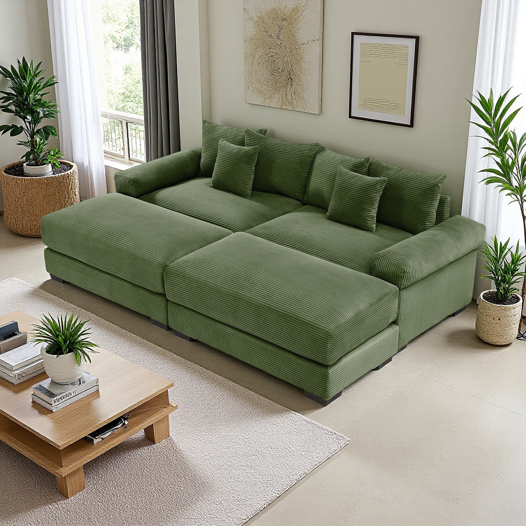 92" Corduroy Modular Cloud 2-Seater Sectional Sofa with Ottoman & 6 Pillows