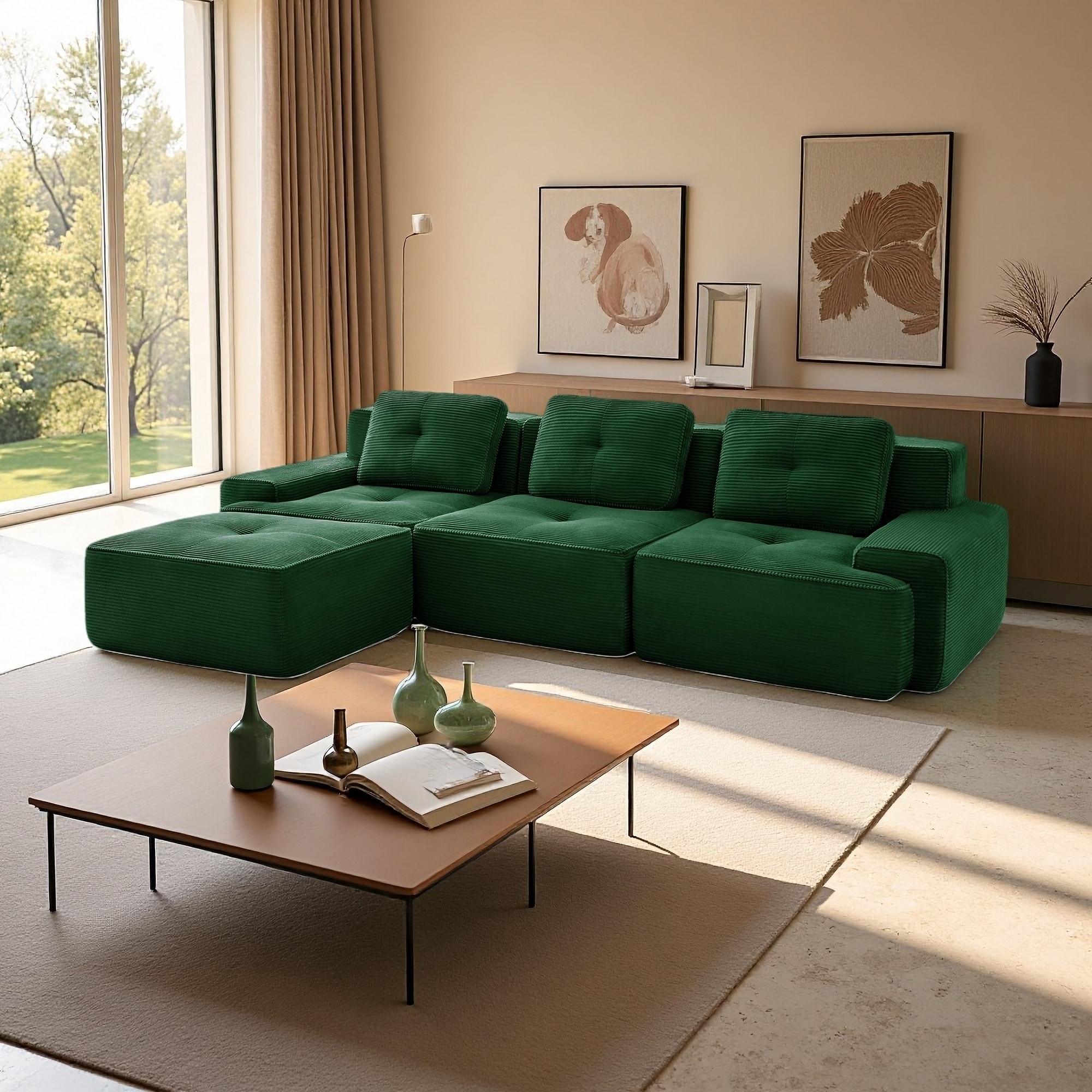 117.3" Corduroy L-Shaped Modular Sectional Sofa with Deep Seat, Movable Ottoman and Tufted Design