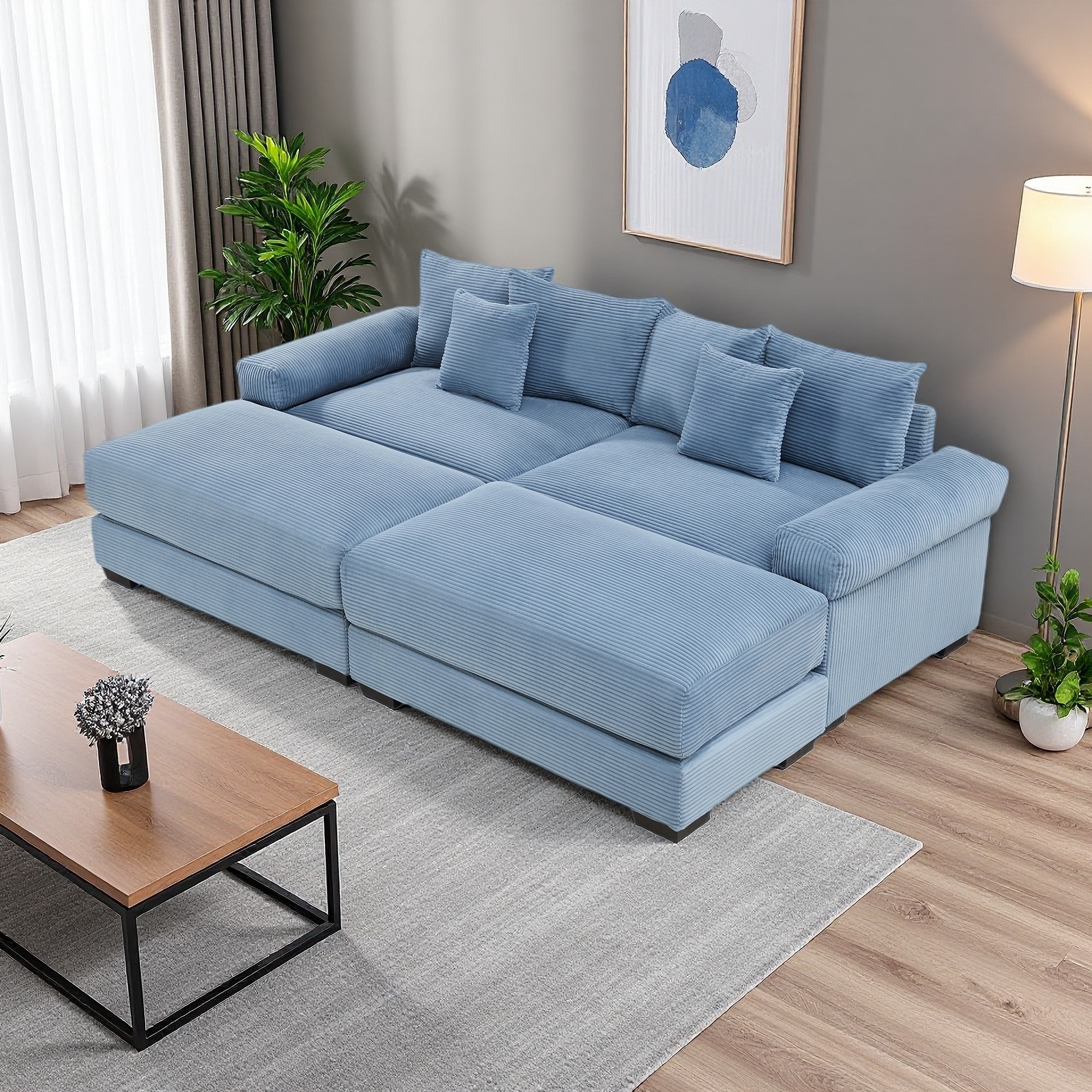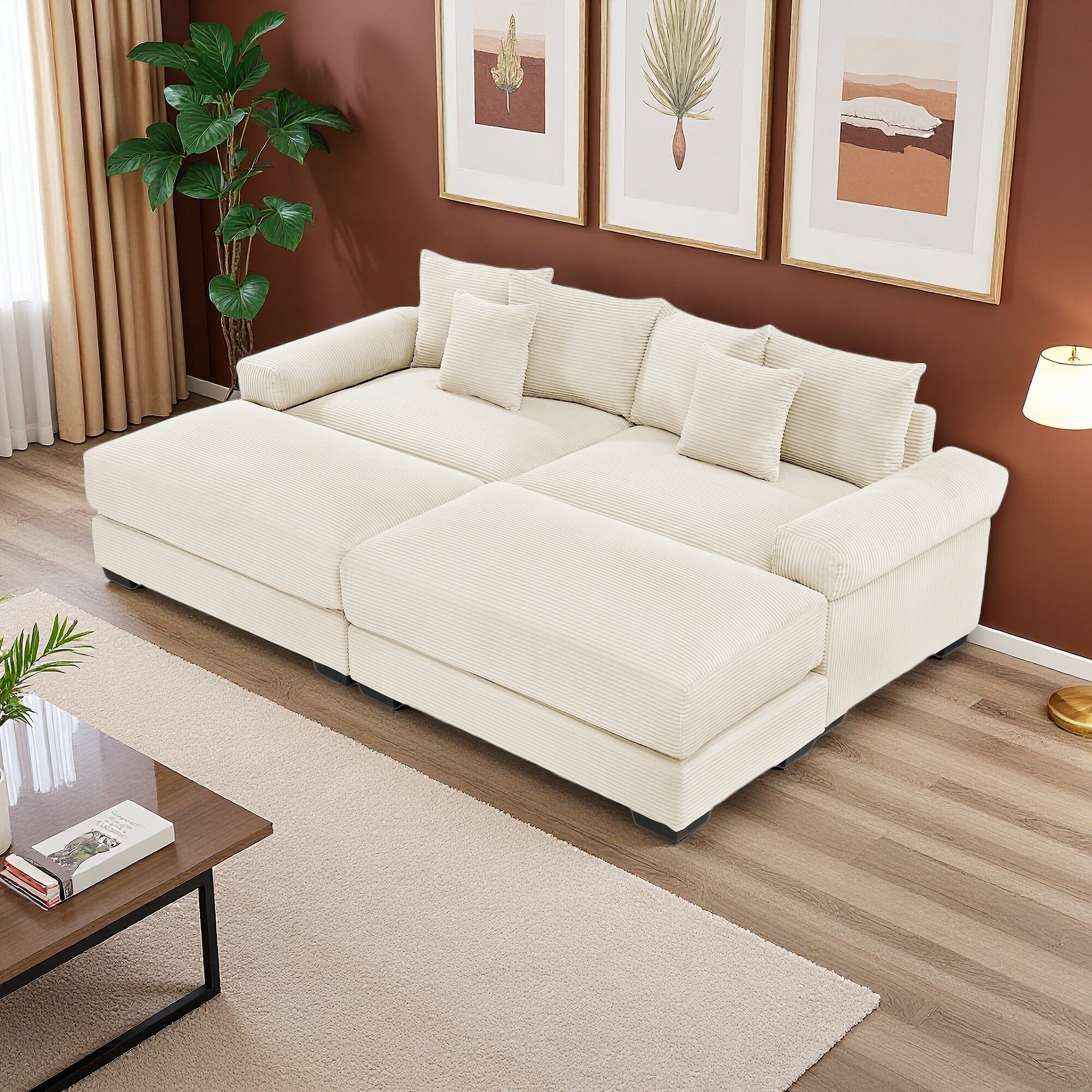 92" Corduroy Modular Cloud 2-Seater Sectional Sofa with Ottoman & 6 Pillows