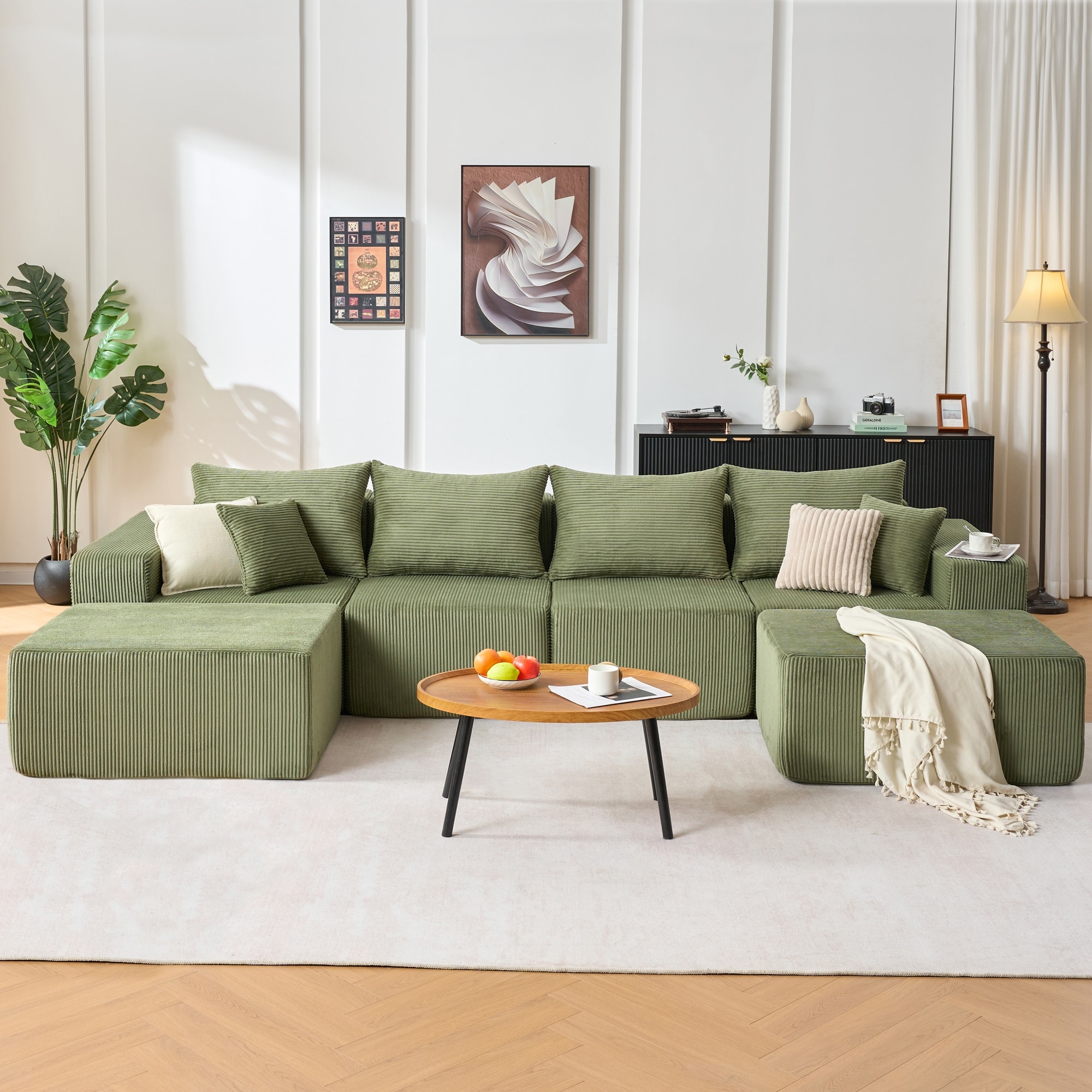 6-Piece Modular Sectional Sofa Set for Living Room, U-Shaped Corduroy Sectional Sofa with Ottomans, Green
