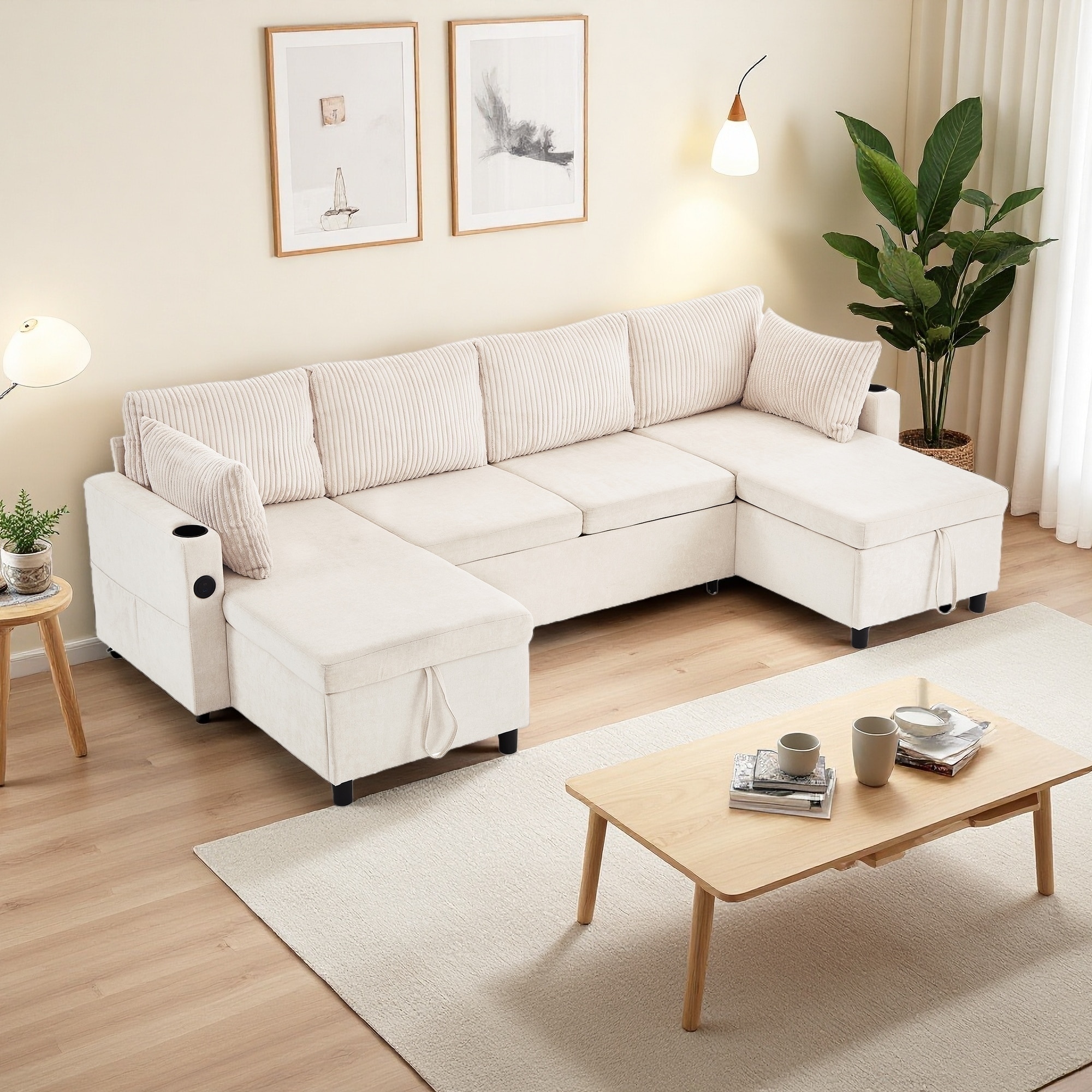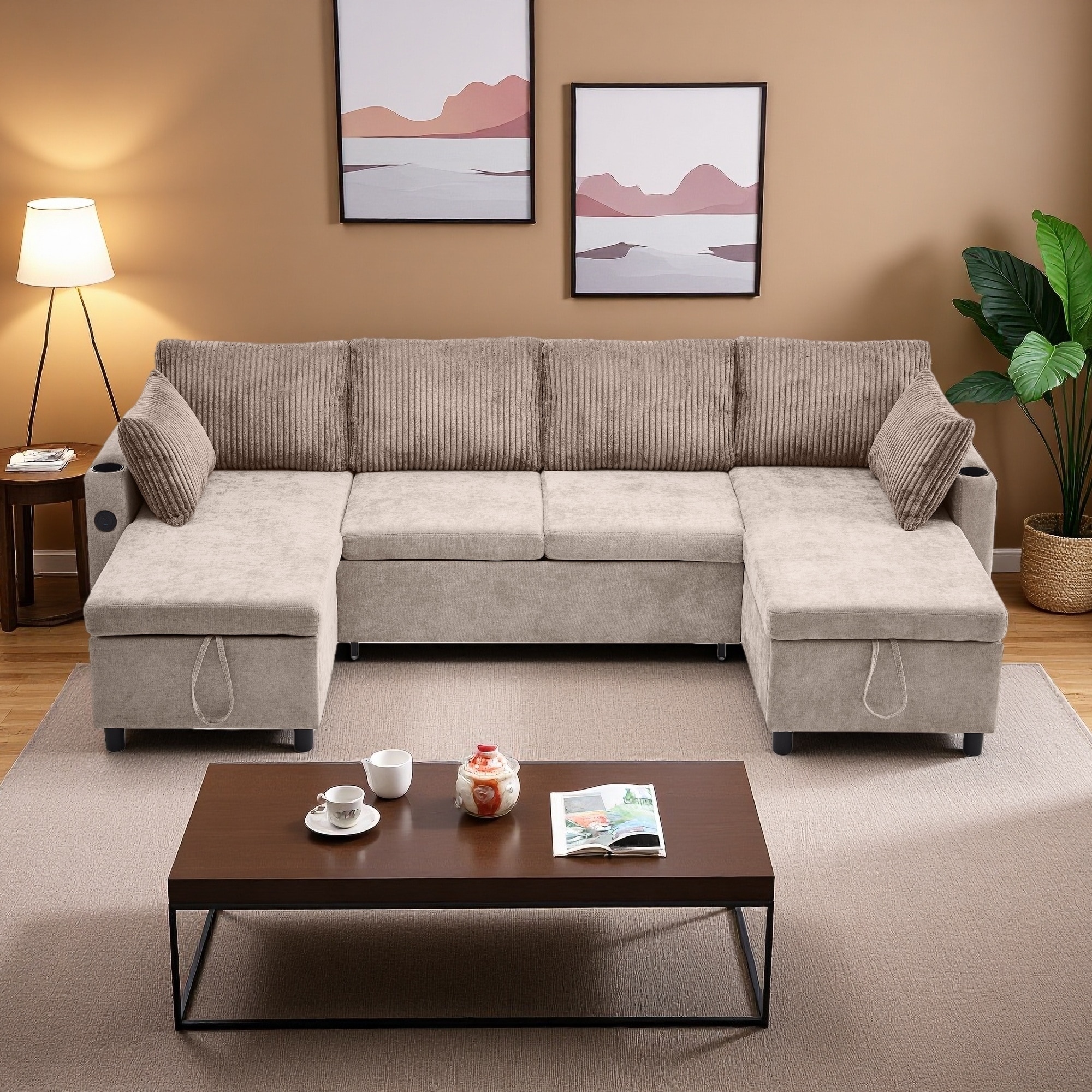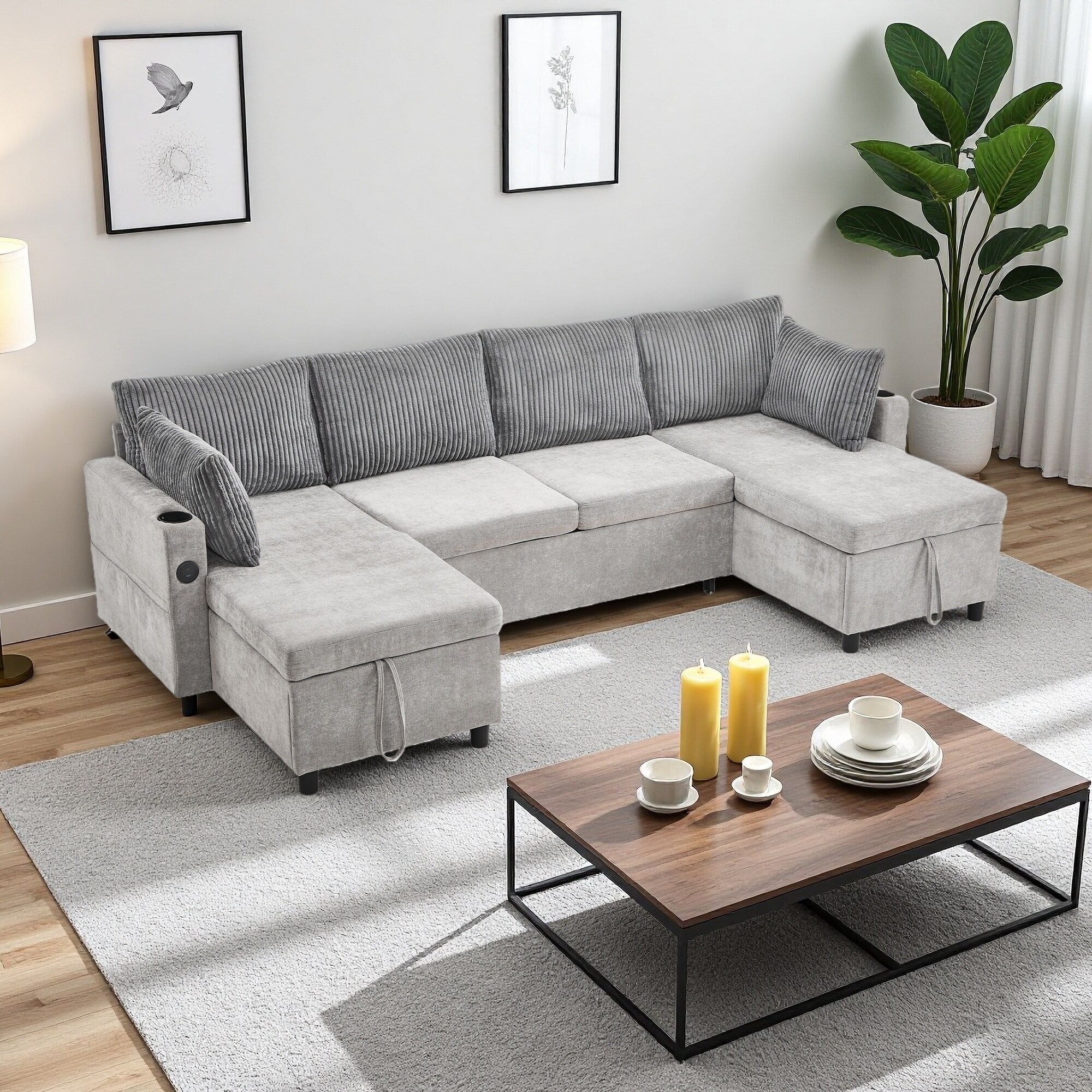113.4" Chenille Sectional Sleeper Sofa with Storage, USB Ports and Cup Holders