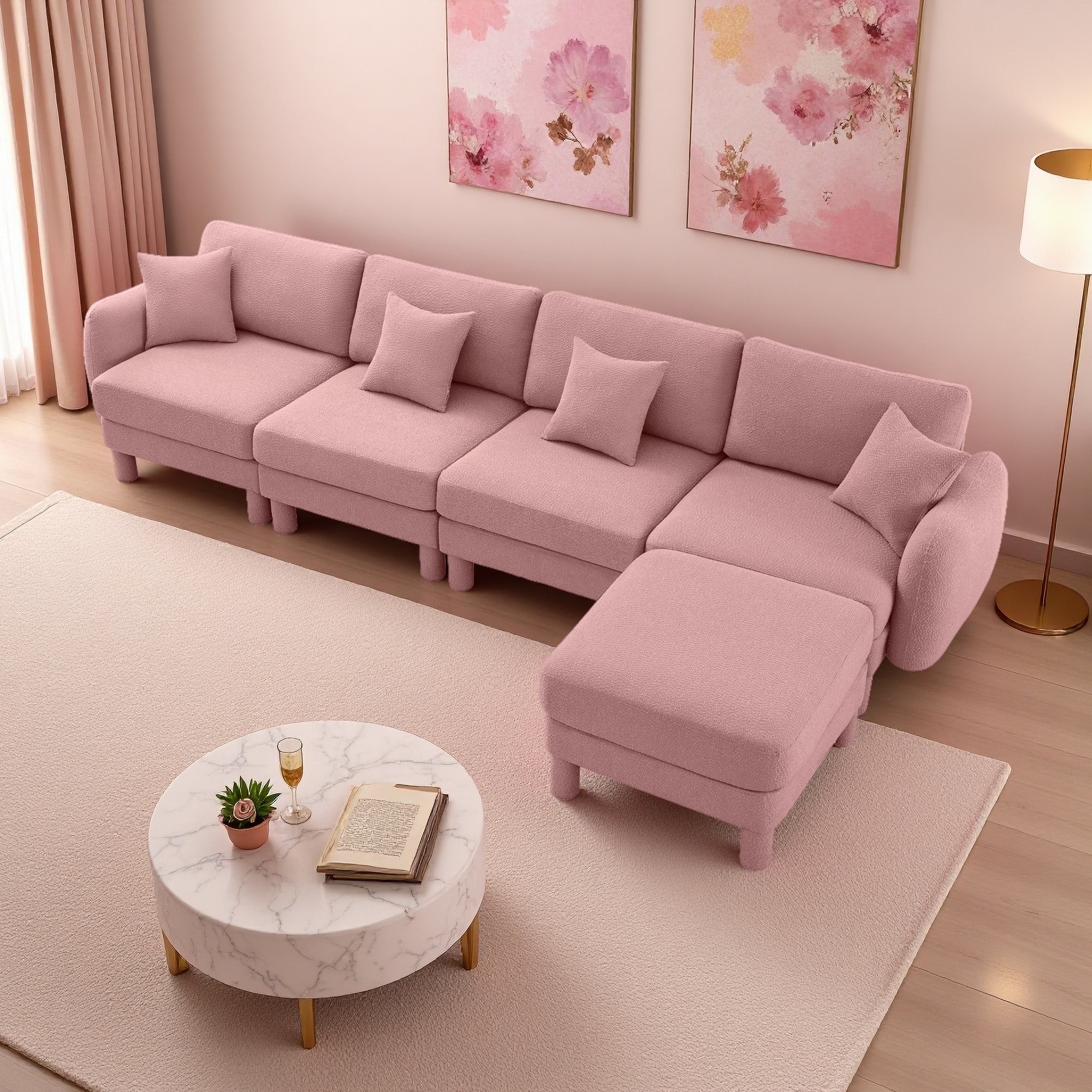 141" Boucle Convertible L-Shaped 4-Seater Sectional Sofa with Shell Armrests & Removable Ottoman