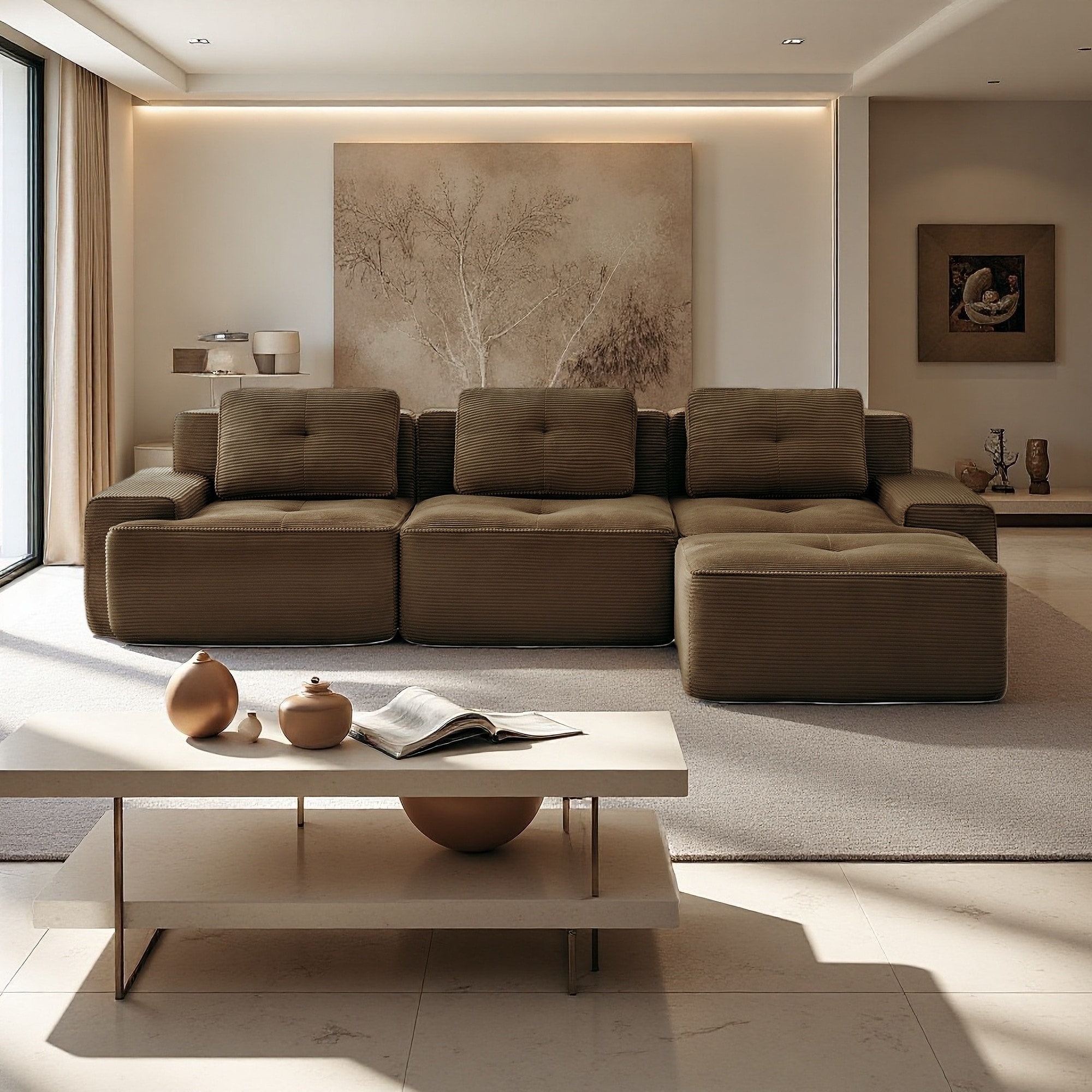 117.3" Corduroy L-Shaped Modular Sectional Sofa with Deep Seat, Ottoman, Tufted