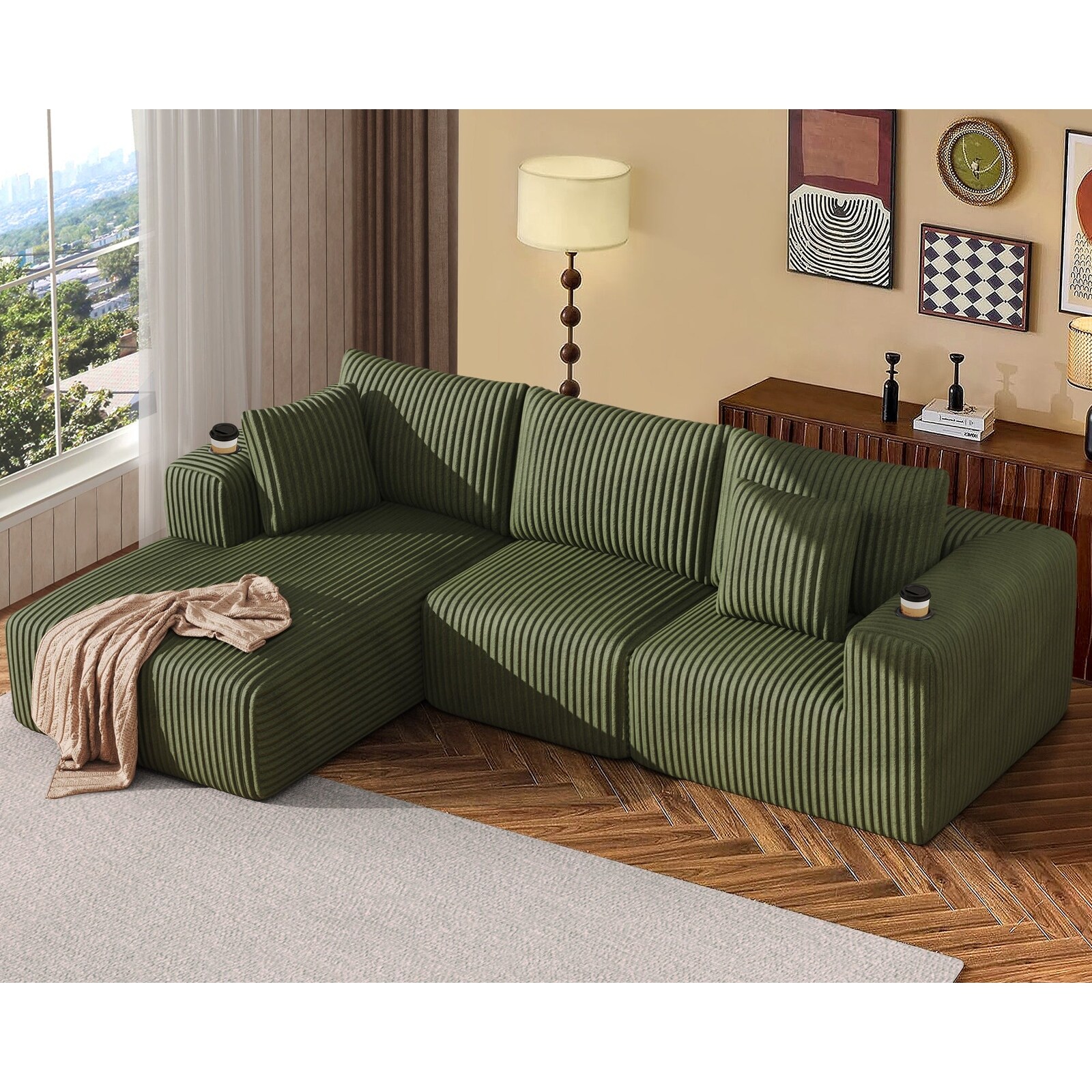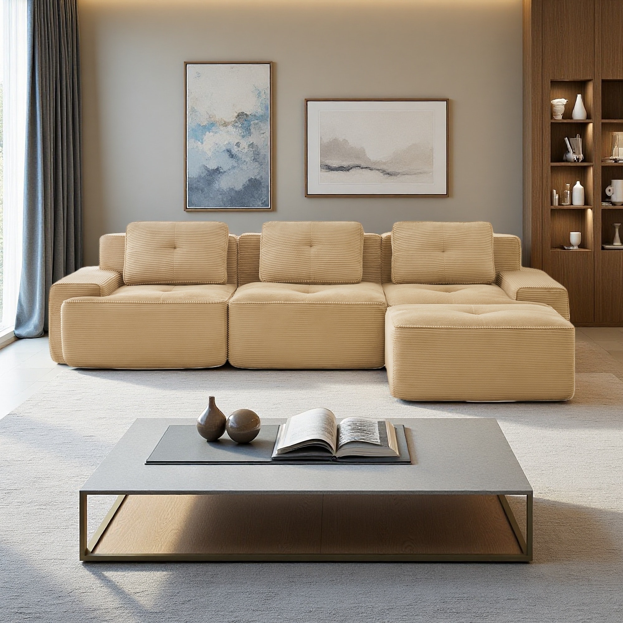 117.3" Corduroy L-Shaped Modular Sectional Sofa with Deep Seat, Ottoman, Tufted