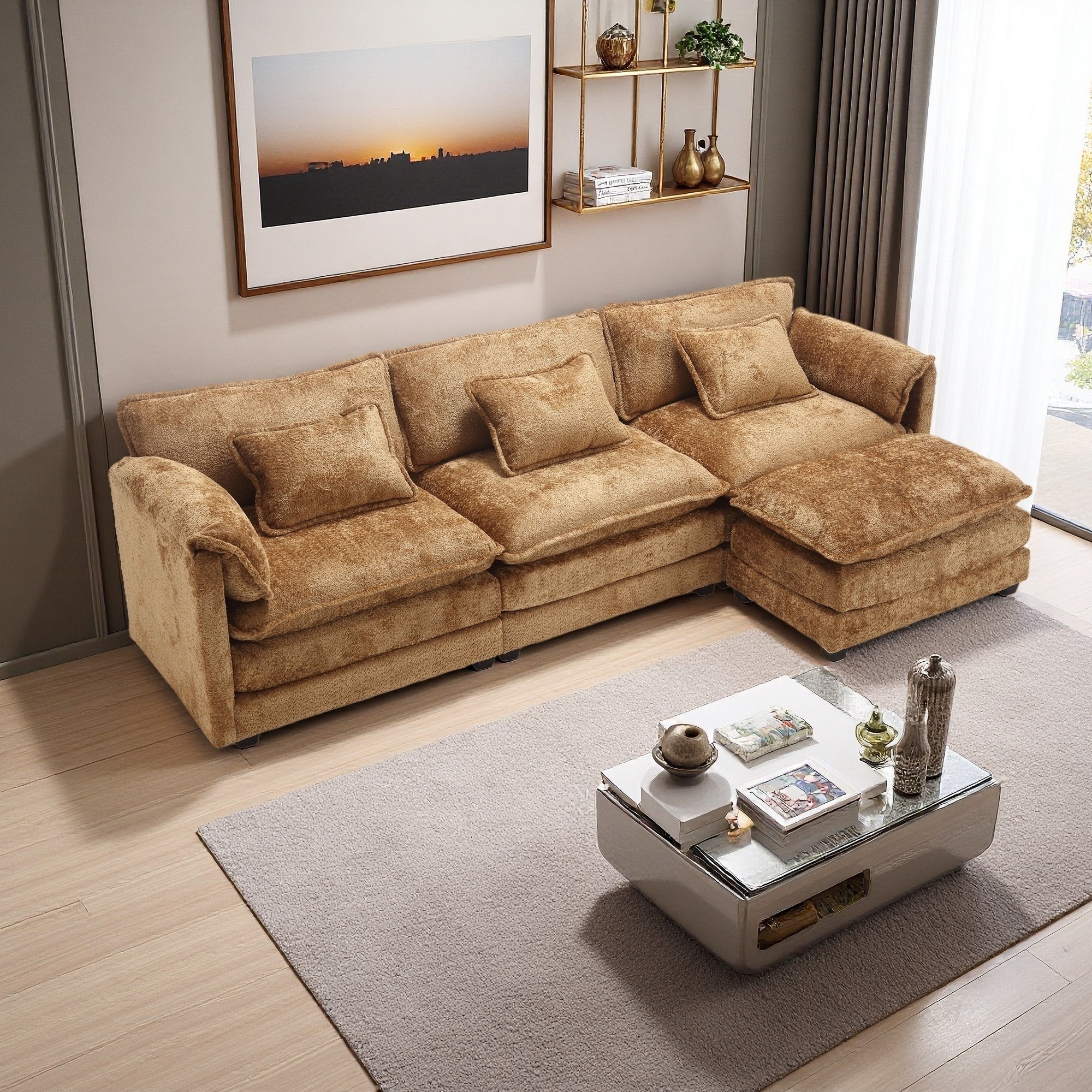 Modular Corduroy Sectional Sofa Set Chaise Couch with Ottoman