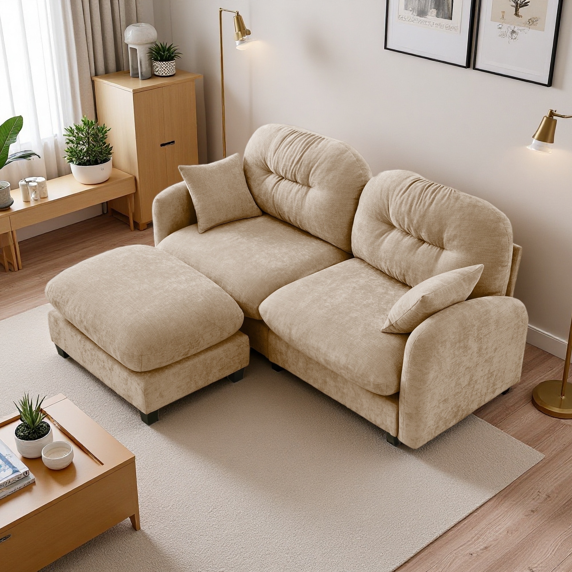 93.7" Velvet 2-Seater Sofa with Ottoman, Round Bolster Armrests and Pillows