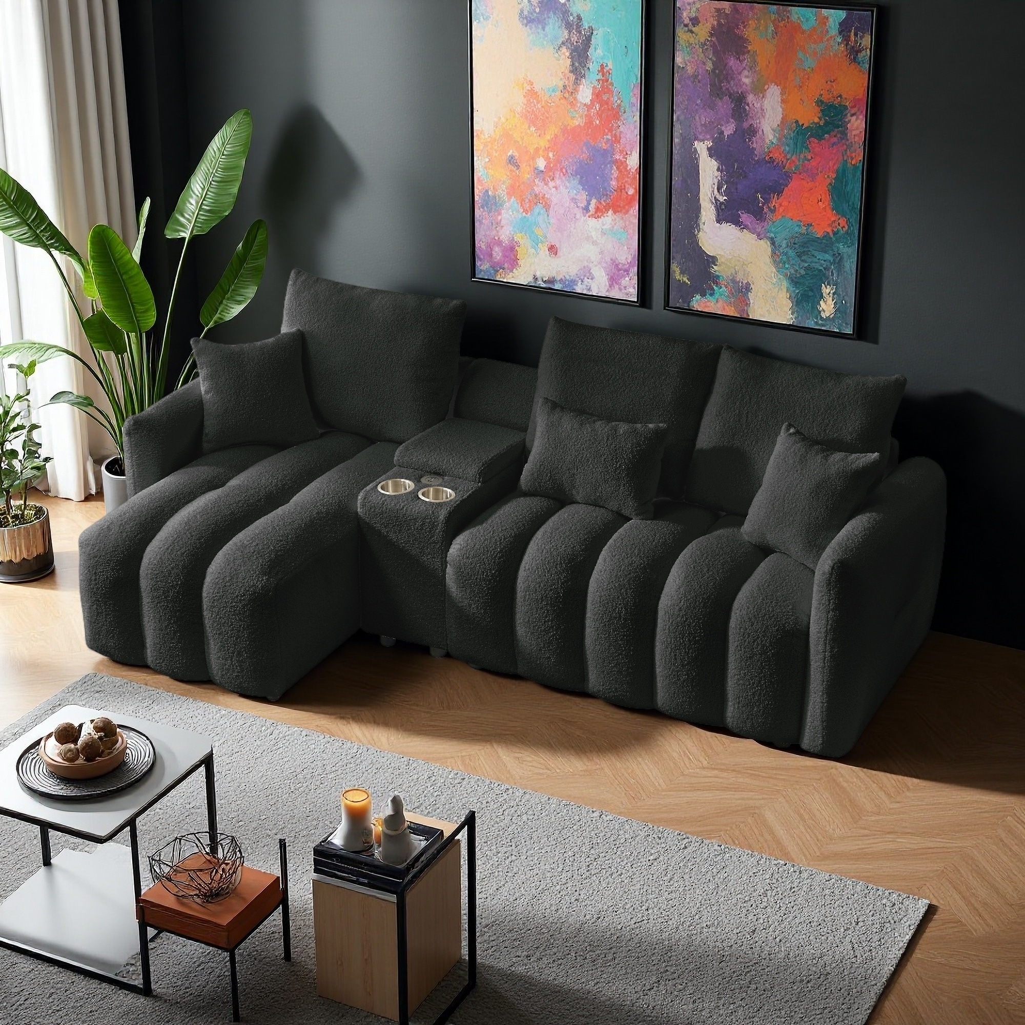 91.73" Teddy Fabric Modern Sectional Cloud Sofa with Console, USB & Cup Holder