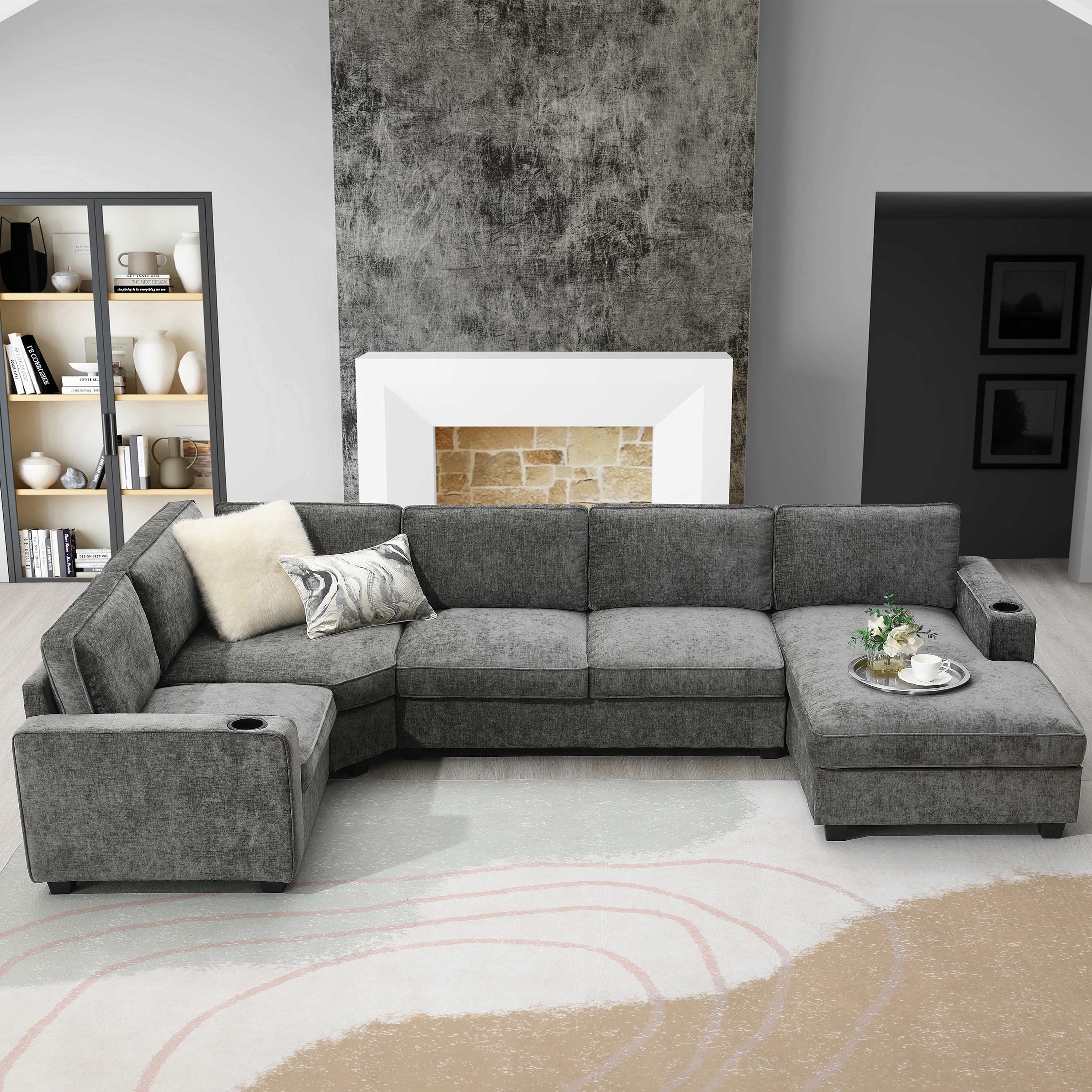 119" U-Shaped Sectional Sofa, 6 Seat Chenille Corner Couch Set with Cup Holders