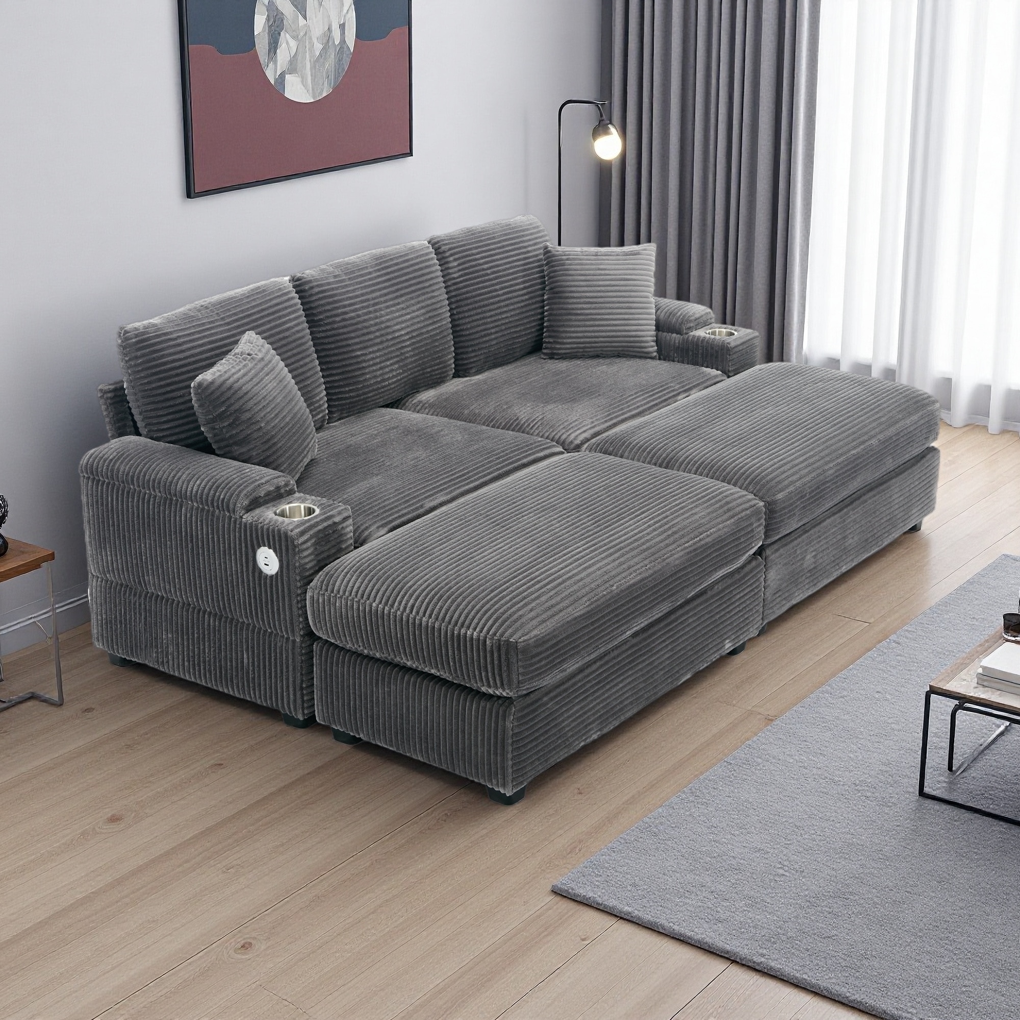 86.61" Corduroy Modular Sectional Sofa with USB Charging and Cup Holders and Armrest Storage