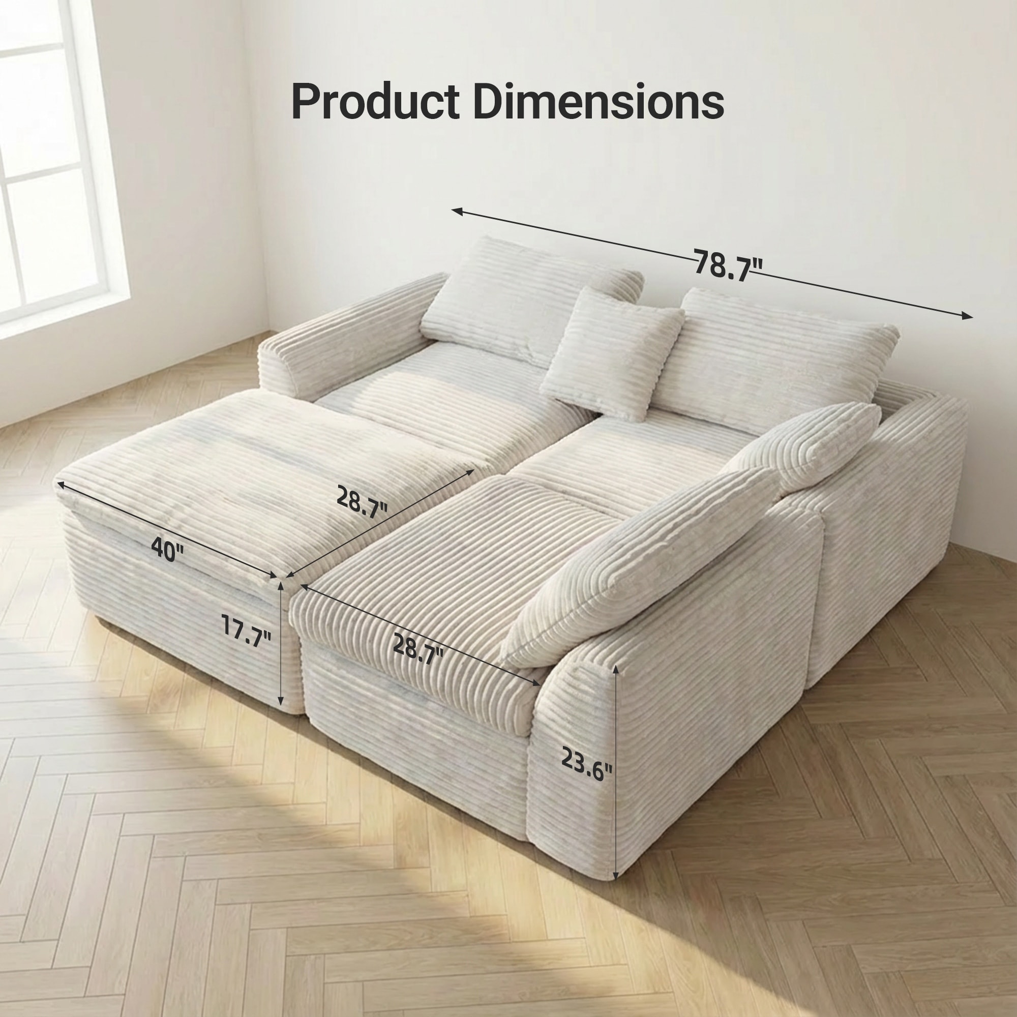 Corduroy Sectional Cloud Couch with Movable Ottoman, High-Density Boneless Sponge Sofa, L-Shape Deep Seat Corner Sofa