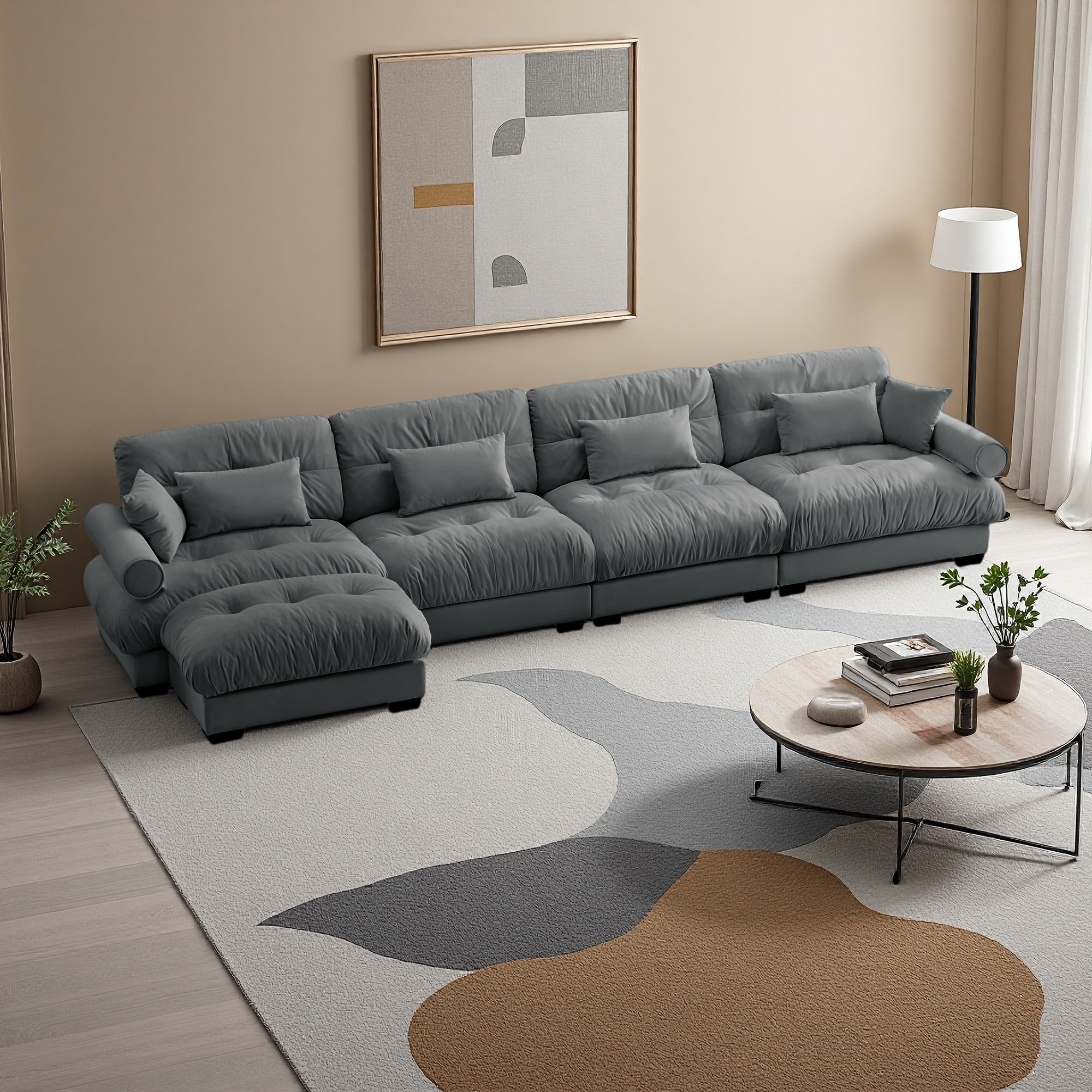 166" Velvet L-Shaped Cloud Sectional Sofa with Pillows (4-Seater)