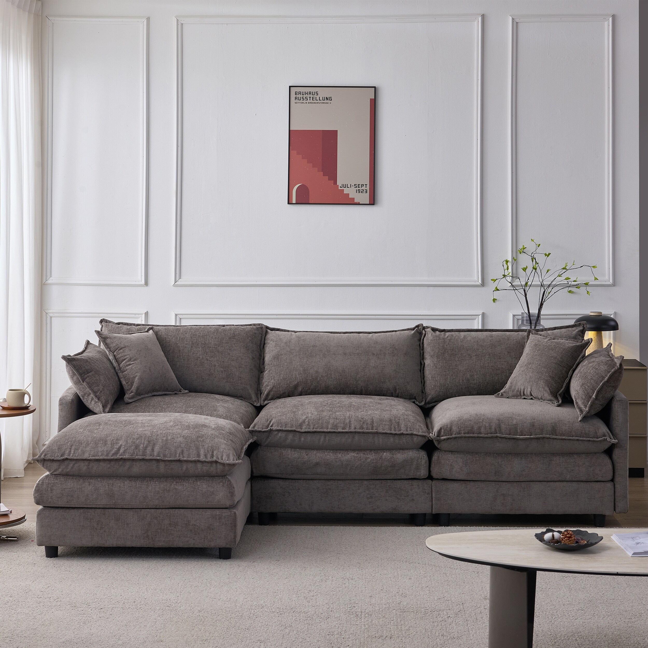 Modern Chenille Modular Sectional Sofa for Living Room, L-Shaped 3-Seater Couch with Ottoman and Tufted Cushion Backrest