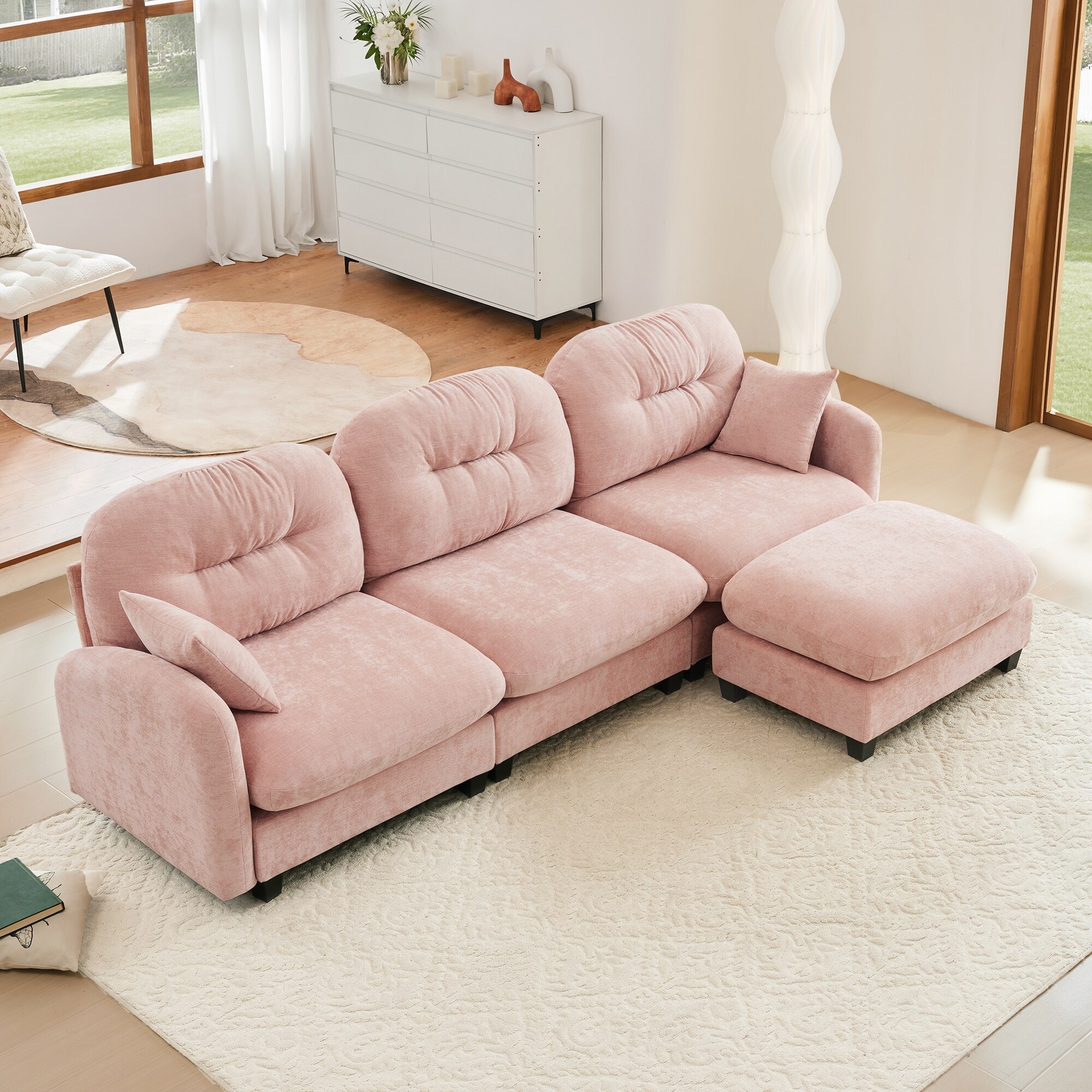 Modern Chenille Modular Sectional Sofa for Living Room, L-Shaped 3-Seater Couch with Ottoman and Tufted Cushion Backrest