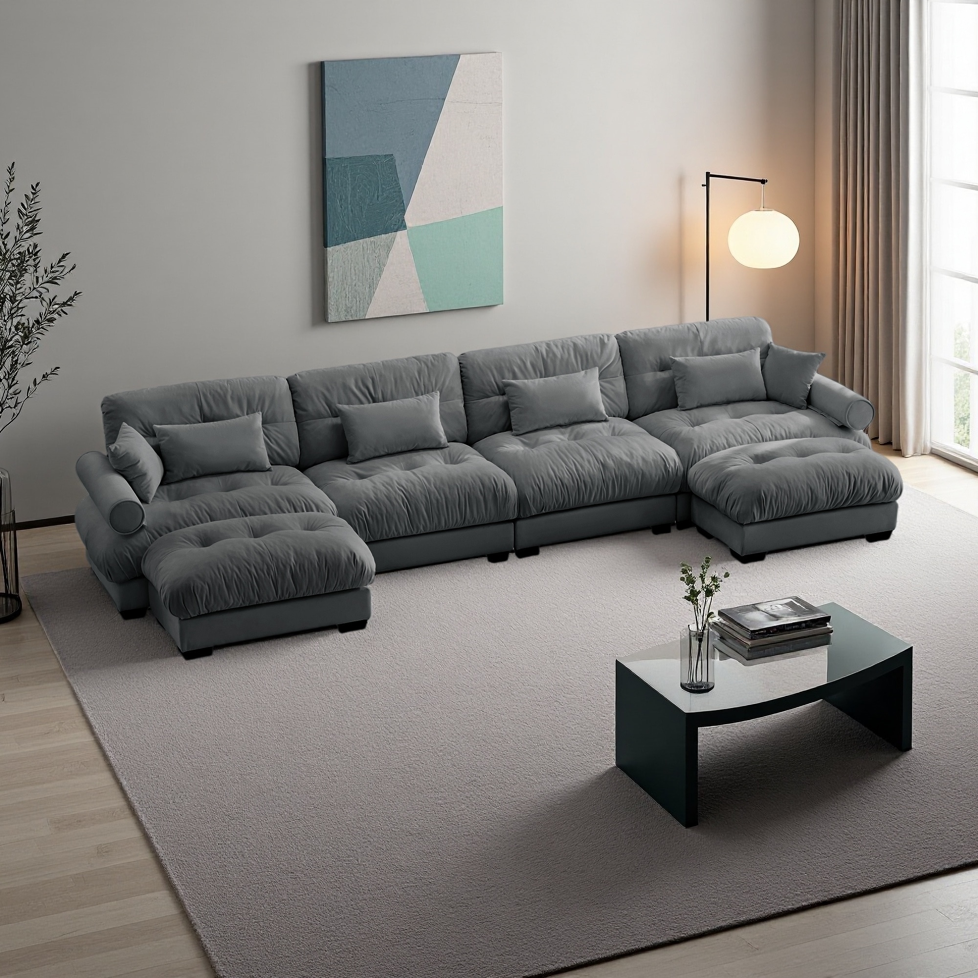 166"Velvet U-Shaped Modular Cloud Sectional Sofa with 2 Ottomans and Pillows (4-Seater)