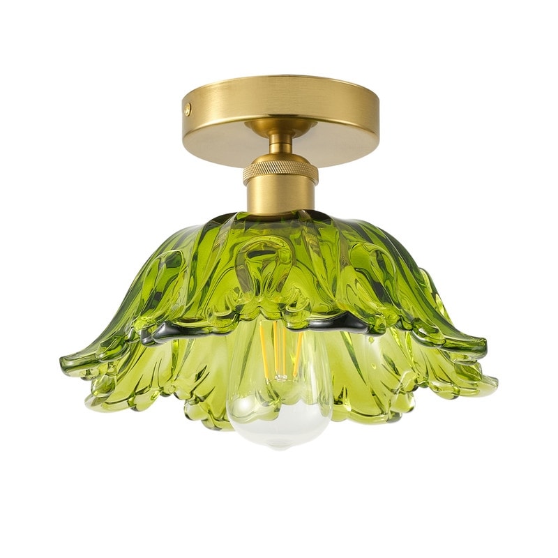 Vintage 1-Light Green Glass Semi Flush Mount Ceiling Fixture with Brass Base