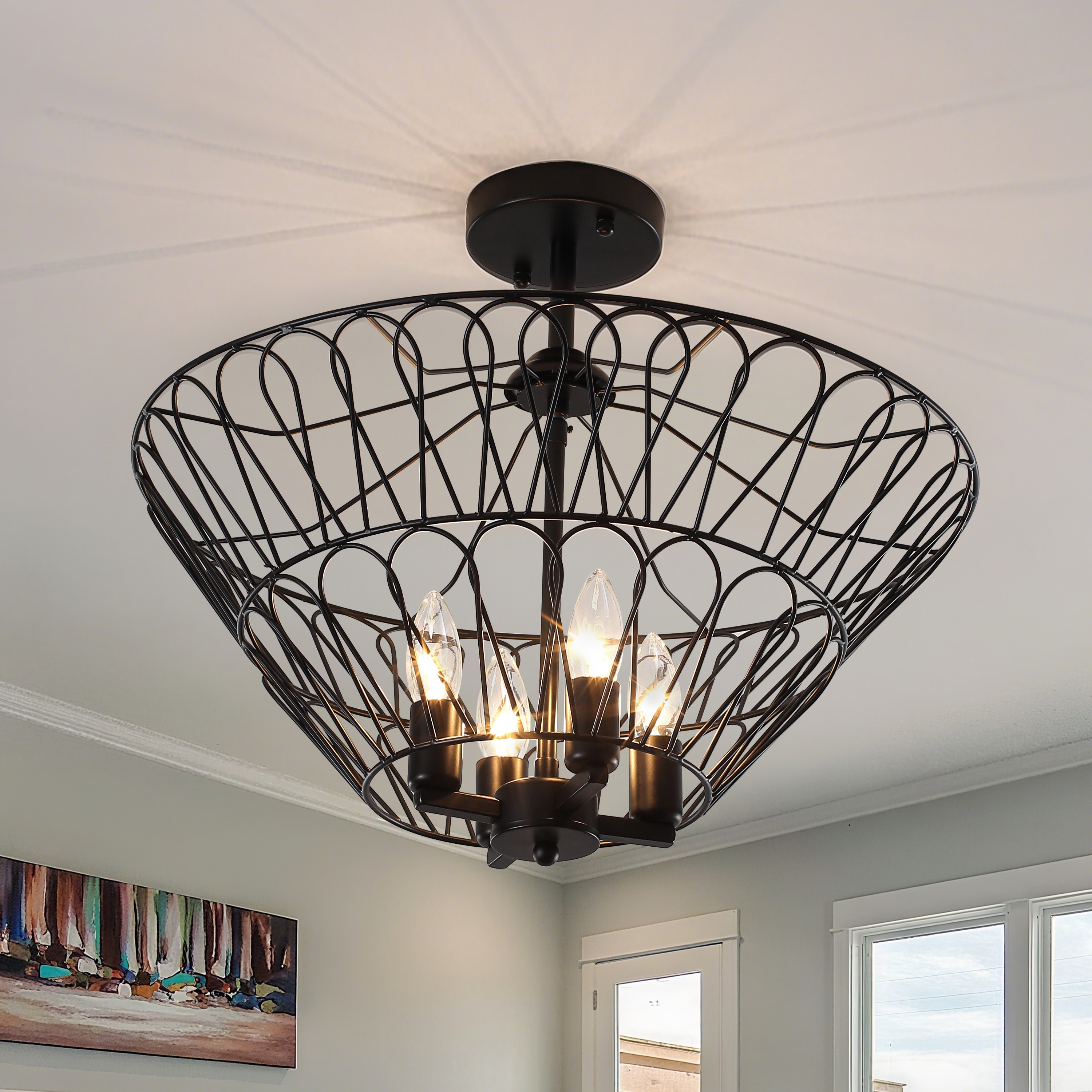 Matte Black 4-Light Metal Open Cage Semi-Flush Mount - Matte Black