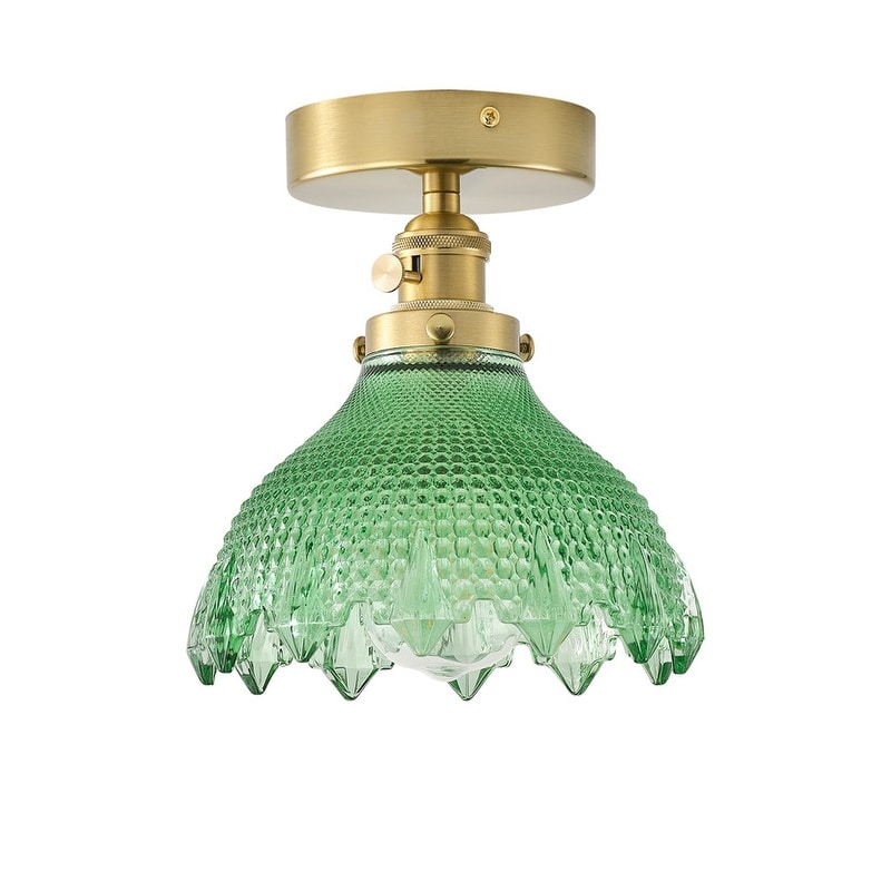 Vintage Green Glass 1-Light Semi Flush Mount Ceiling Light with Brass Finish