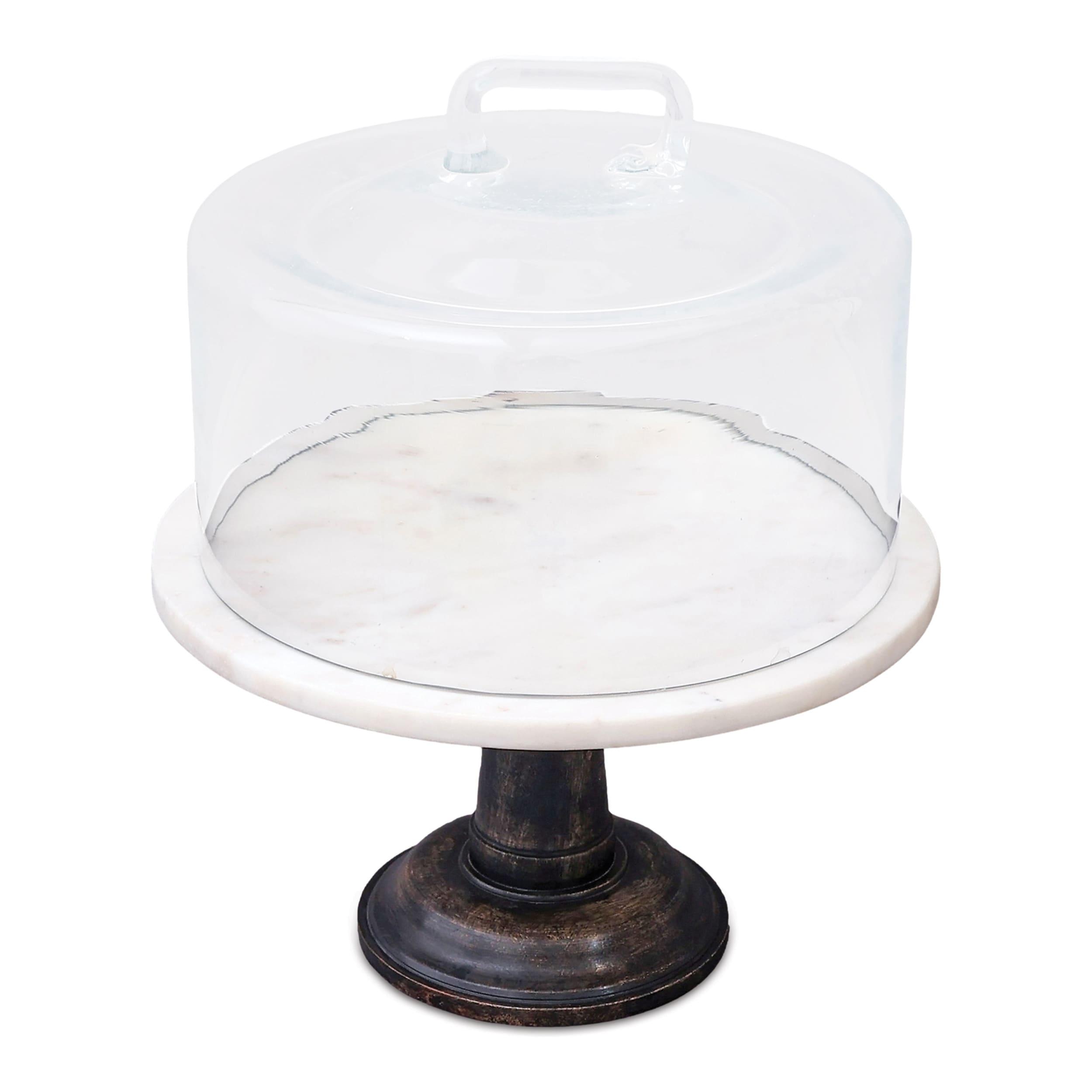 Luxury Marble Pedestal Cake Stand with Glass Dome 24” Round Black & White Natural Stone Tray - 24” (L) x 24” (W) x 14.75” (H)