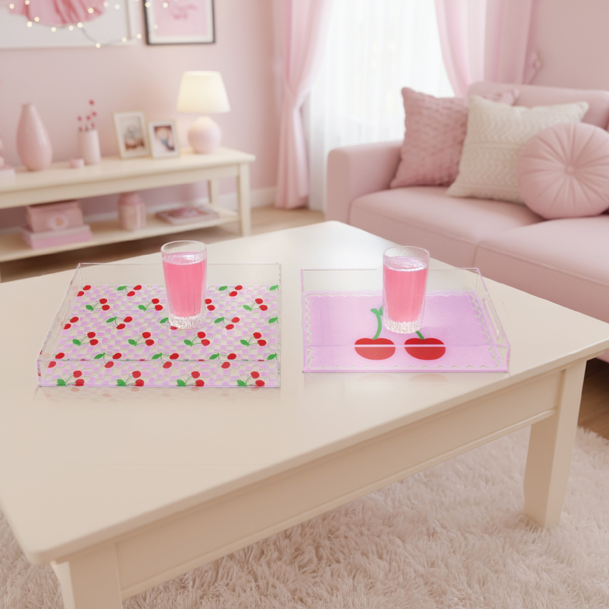 American Art Décor 2-pc Acrylic Cherry & Pink Serving Trays with Handles - Decorative Set - 10" x 14"