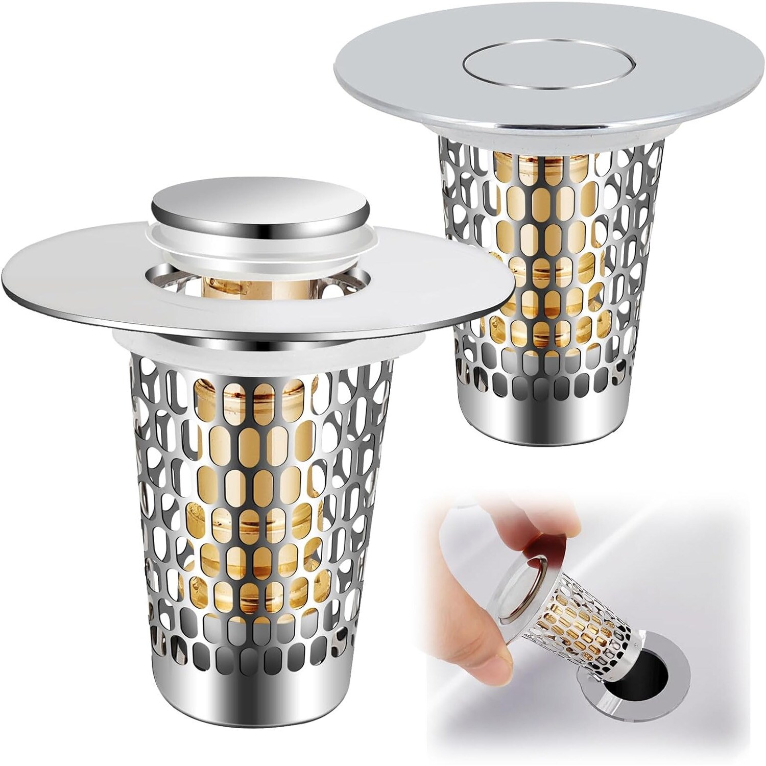 2-Pack Universal Bathroom Sink Stopper, Stainless Steel Drain Filter with Hair Strainer, for 1-1.5in (Silver)