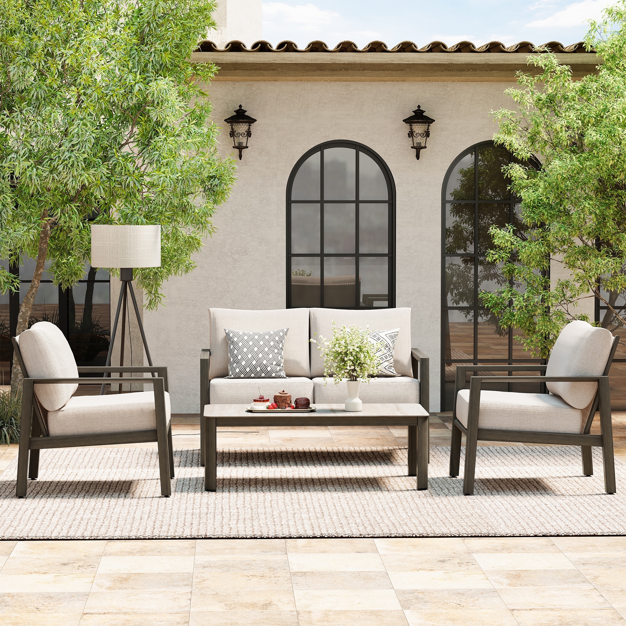 Nimbus 4-Piece Brown Aluminum Patio Conversation Set with Sunbrella Light Gray Cushions and Coffee Table