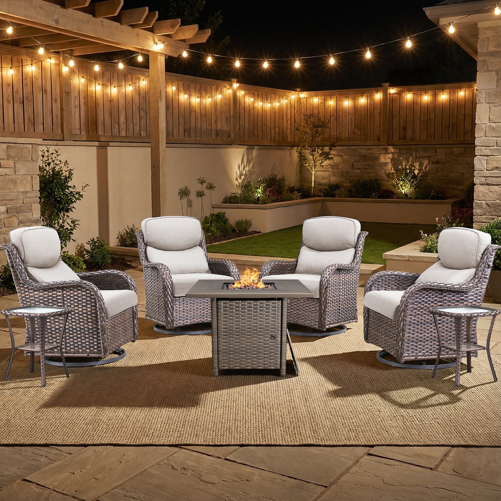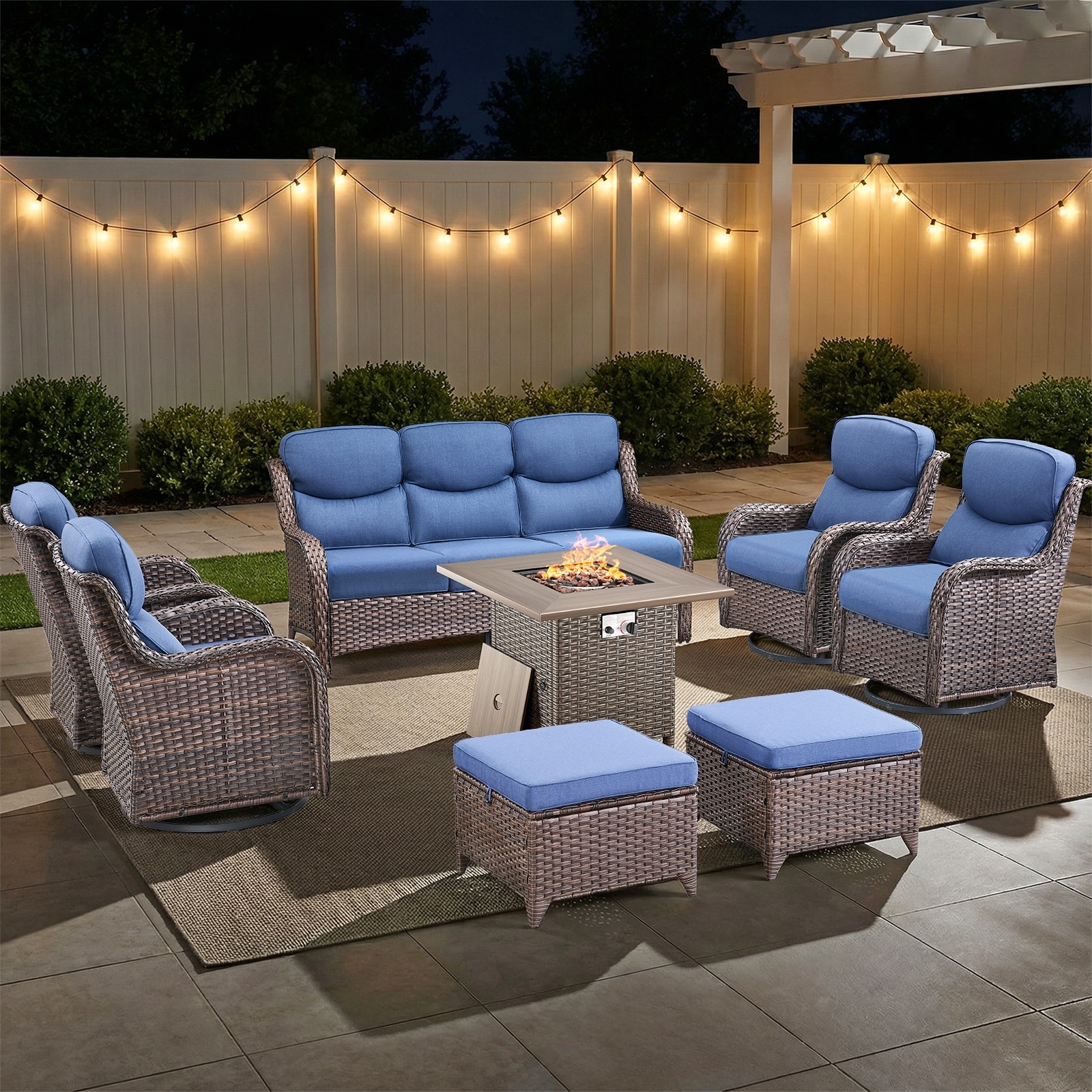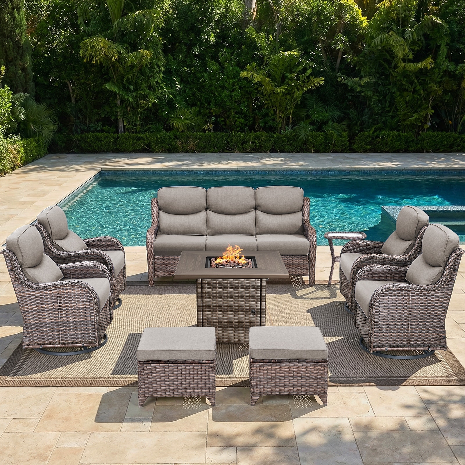 HOOOWOOO 9-piece Wicker Patio Wide Armrest Sectional Sofa Set with Swivel Chairs and Fire Pit