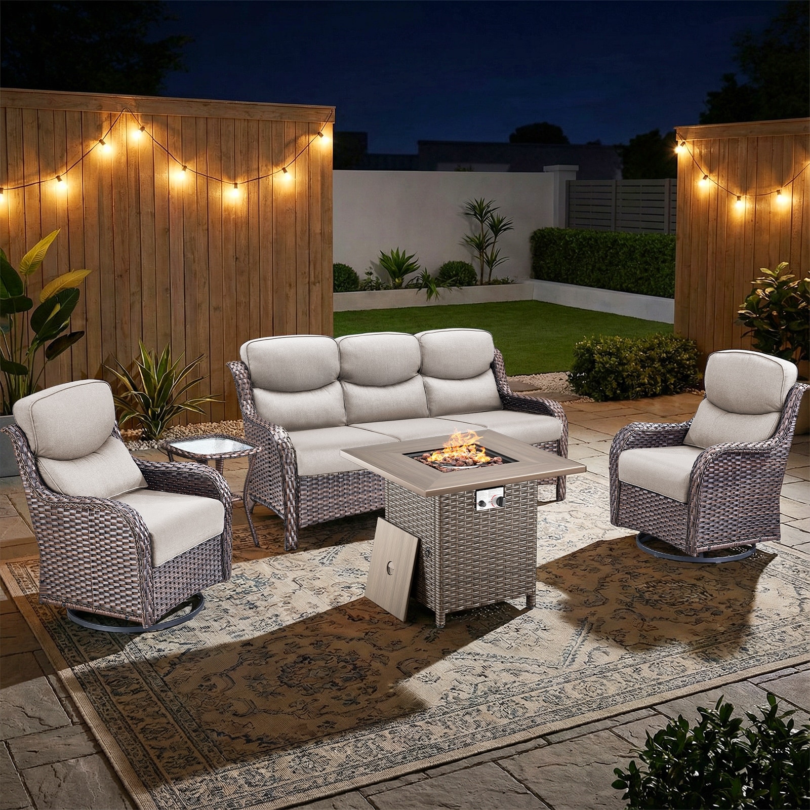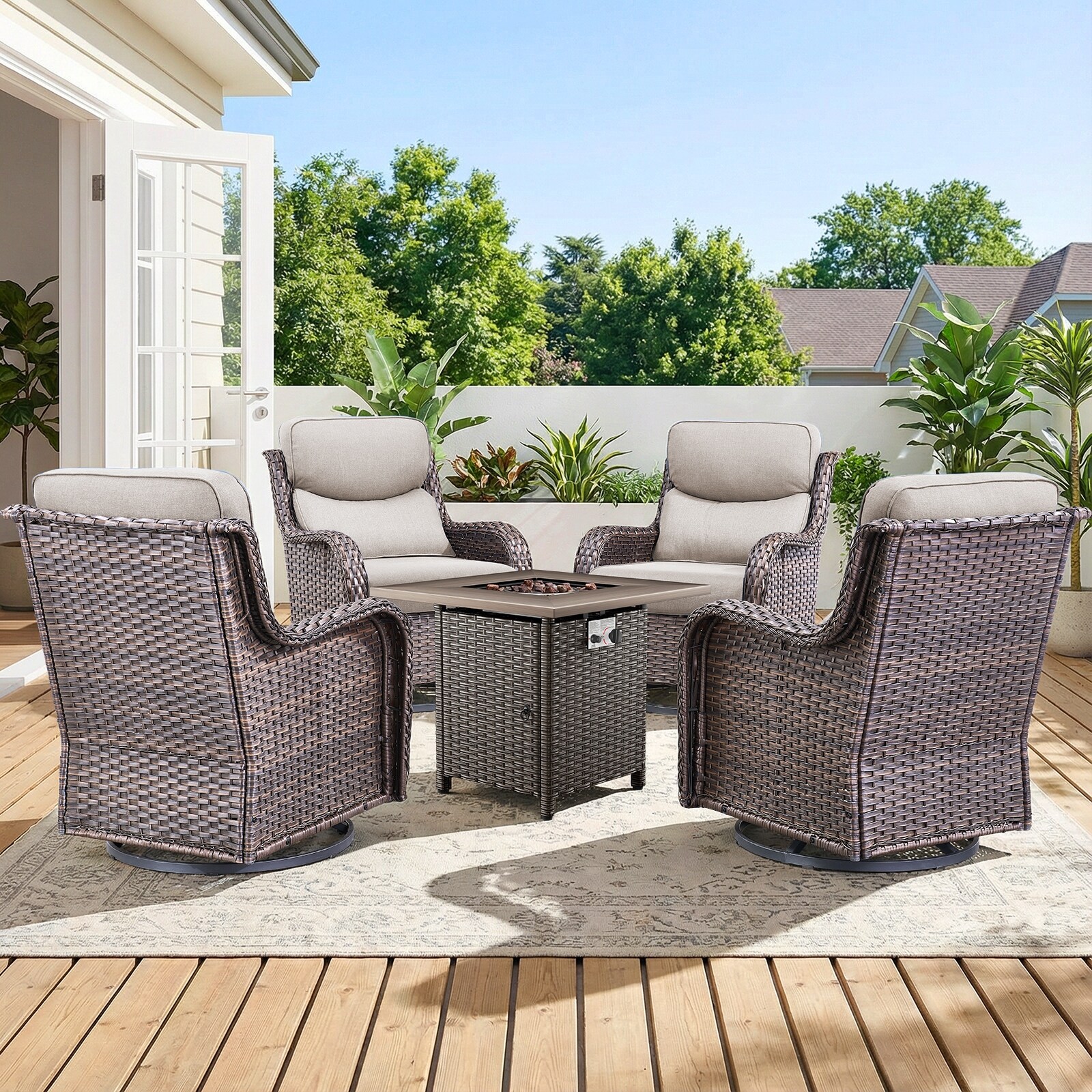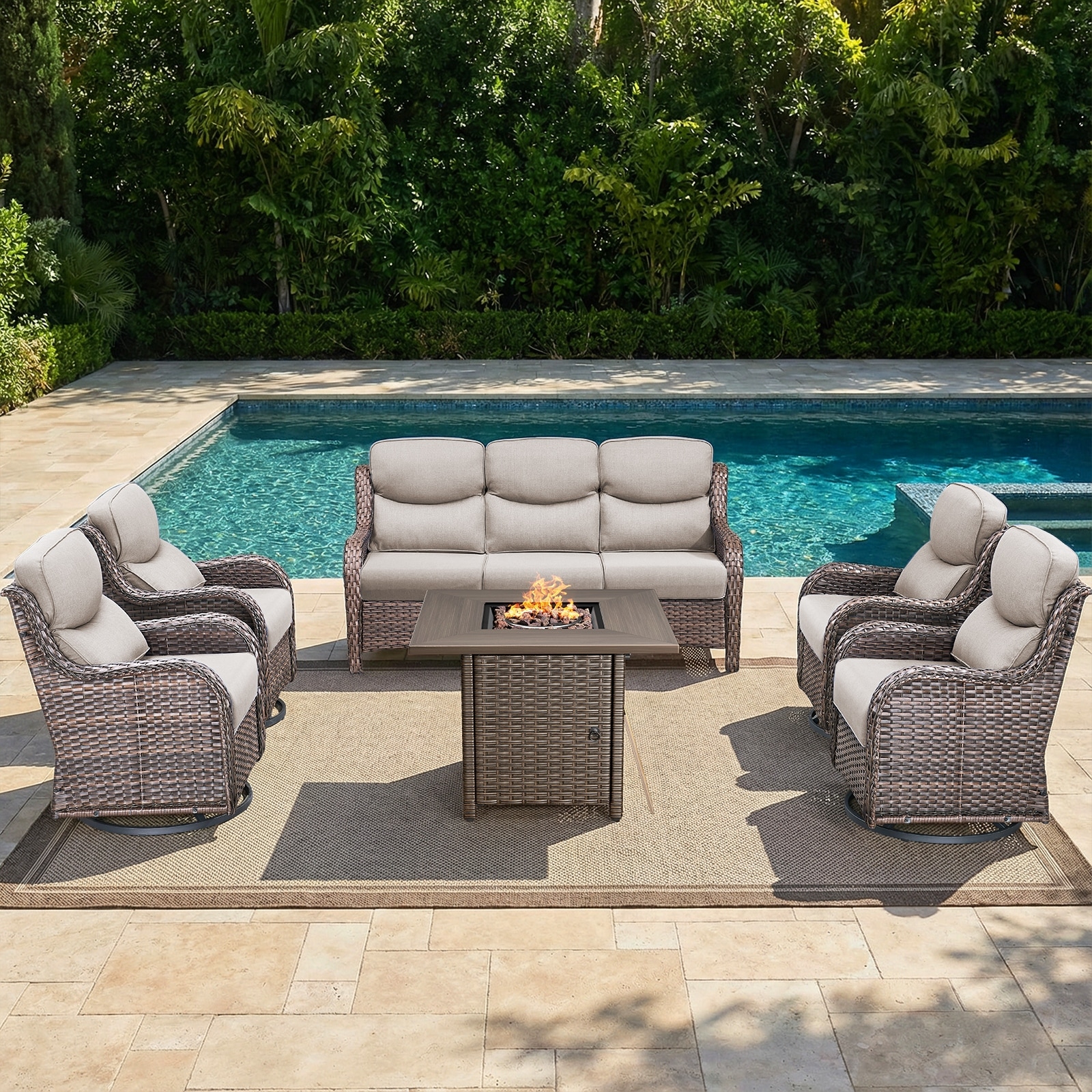 Pocassy Outdoor Propane Fire Pit Table with Sofa Swivel Chair Funiture Set.