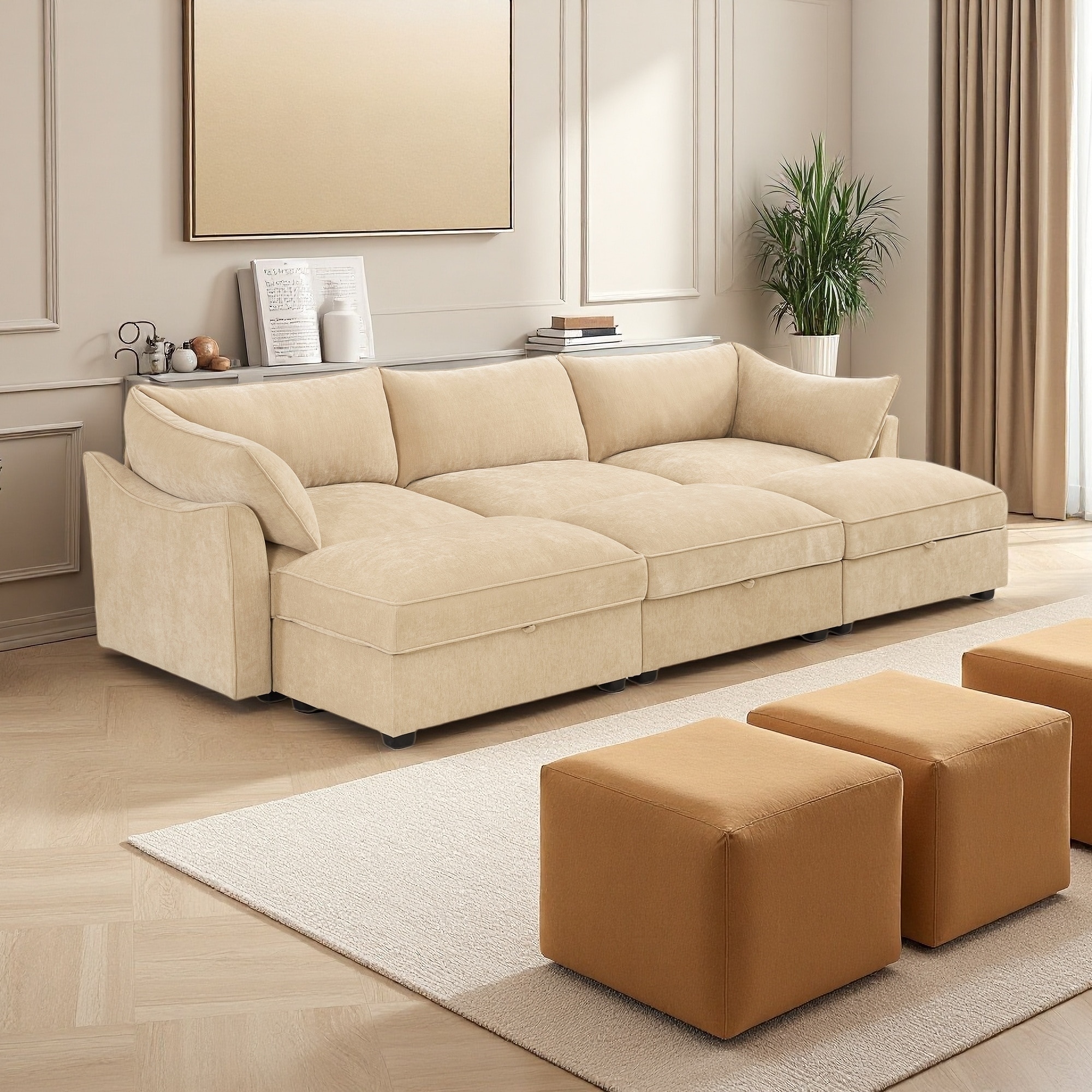 112.6" Chenille Modular 3-Seater Sectional Sofa with 3 Ottomans & Under-Seat Drawers