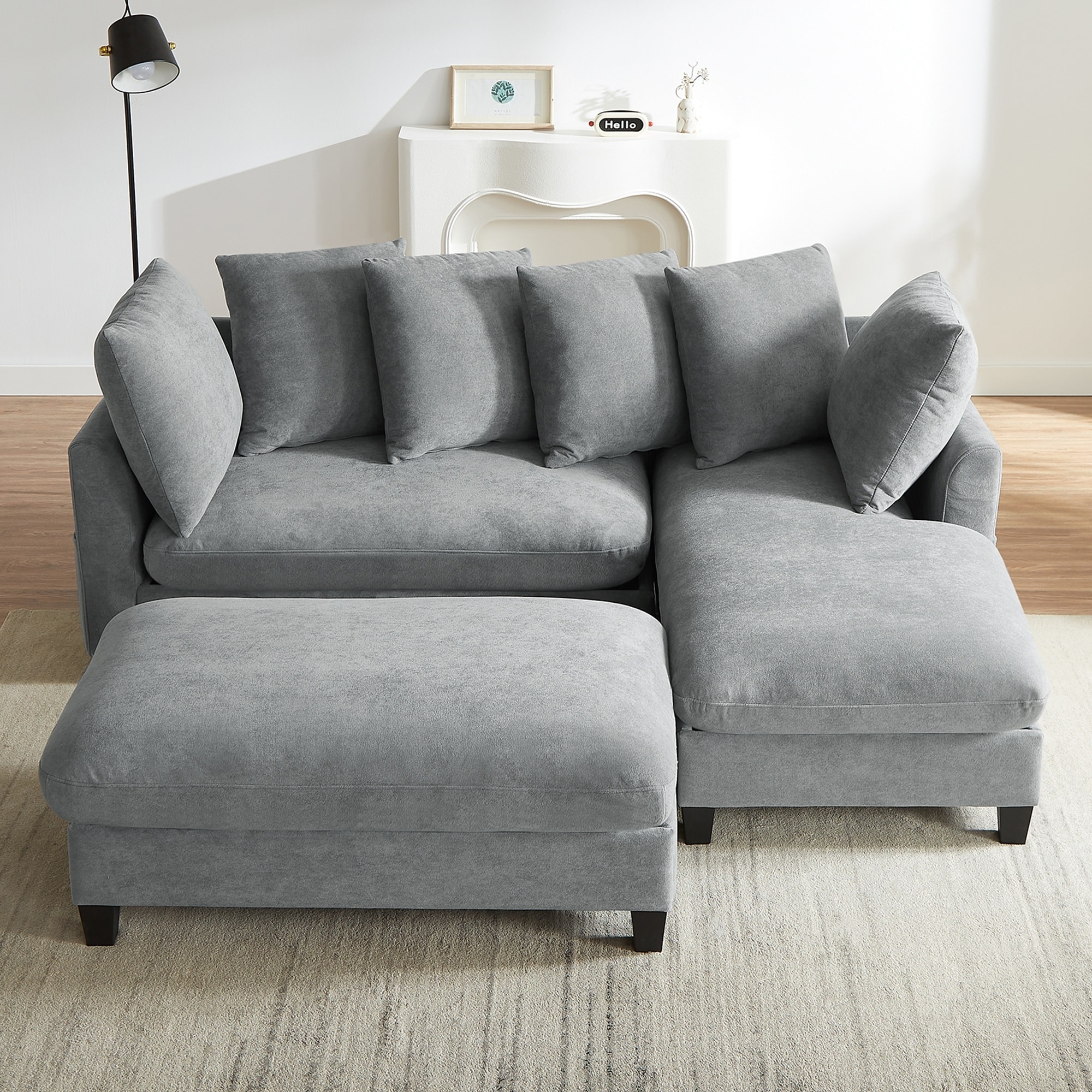 Sectional Sofa with Hidden Storage, Movable Ottoman, Side Pockets, Pillows and Curved Armrests - Chenille