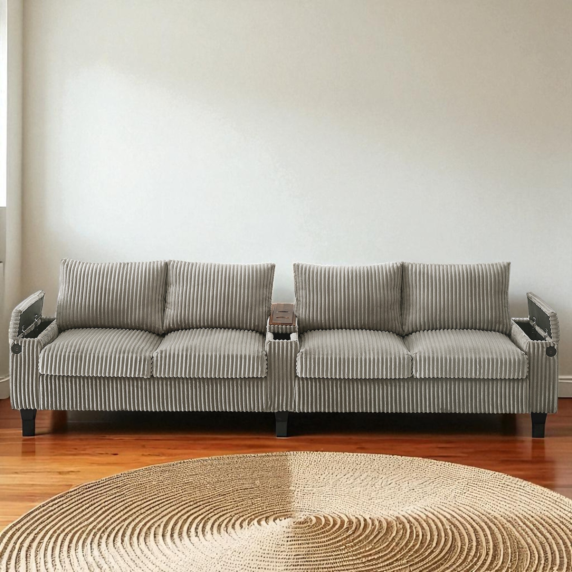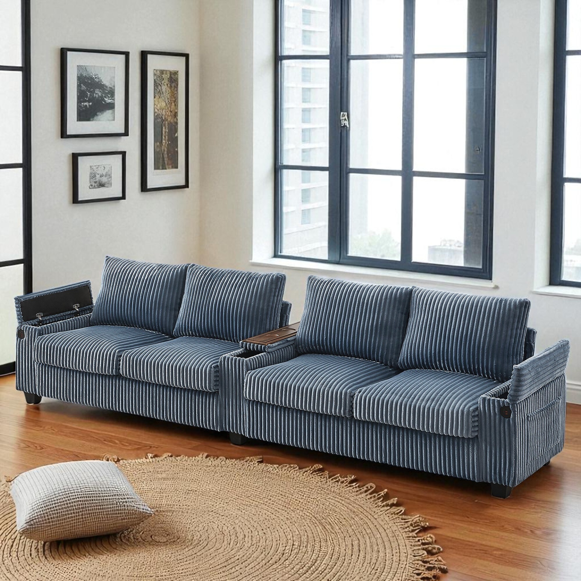 4-Seat Sofa with USB Charging Ports, Storage Armrests, Flip-Down Cup Holders, Corduroy Upholstery