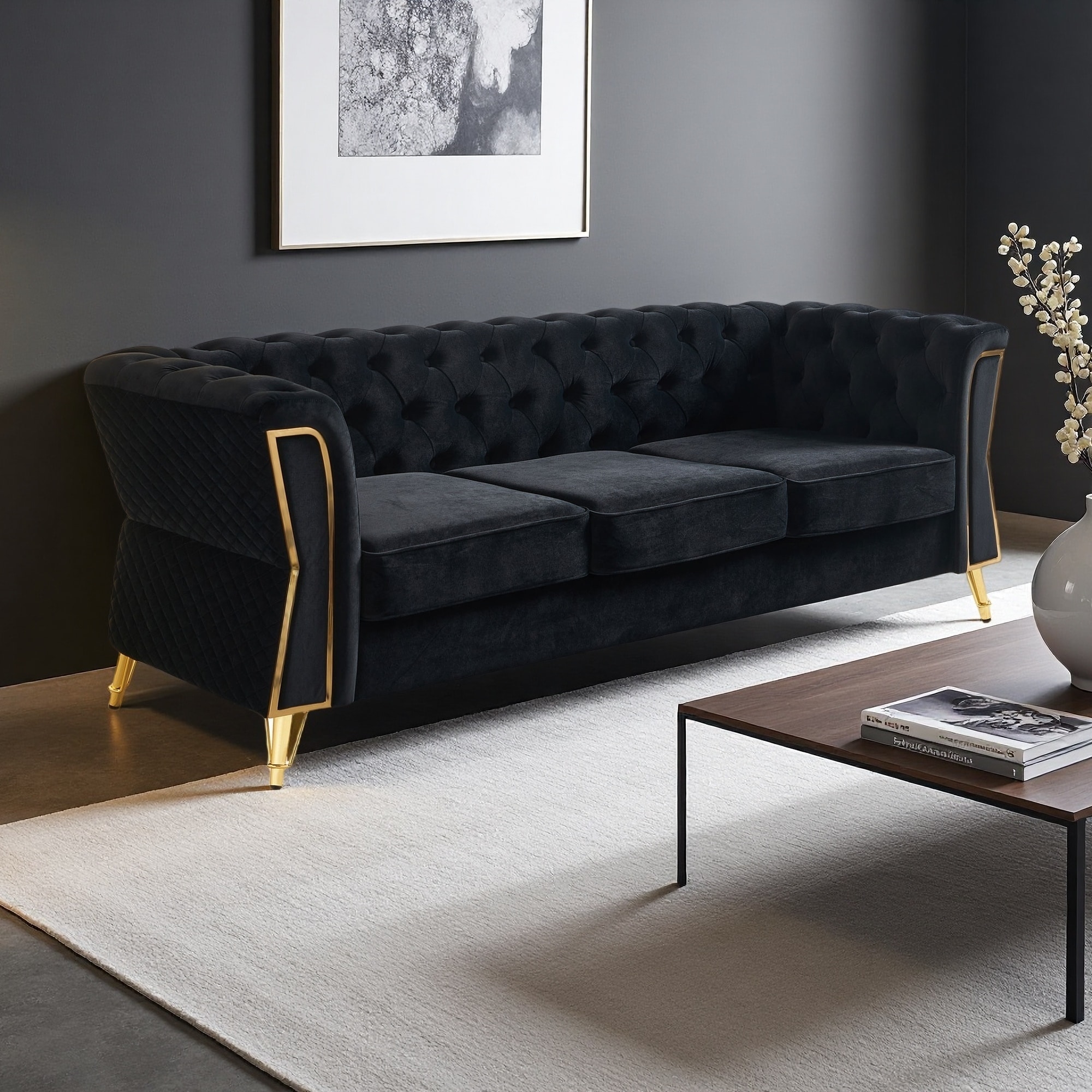87.4" Velvet Tufted 3-Seater Sofa with Gold Trim