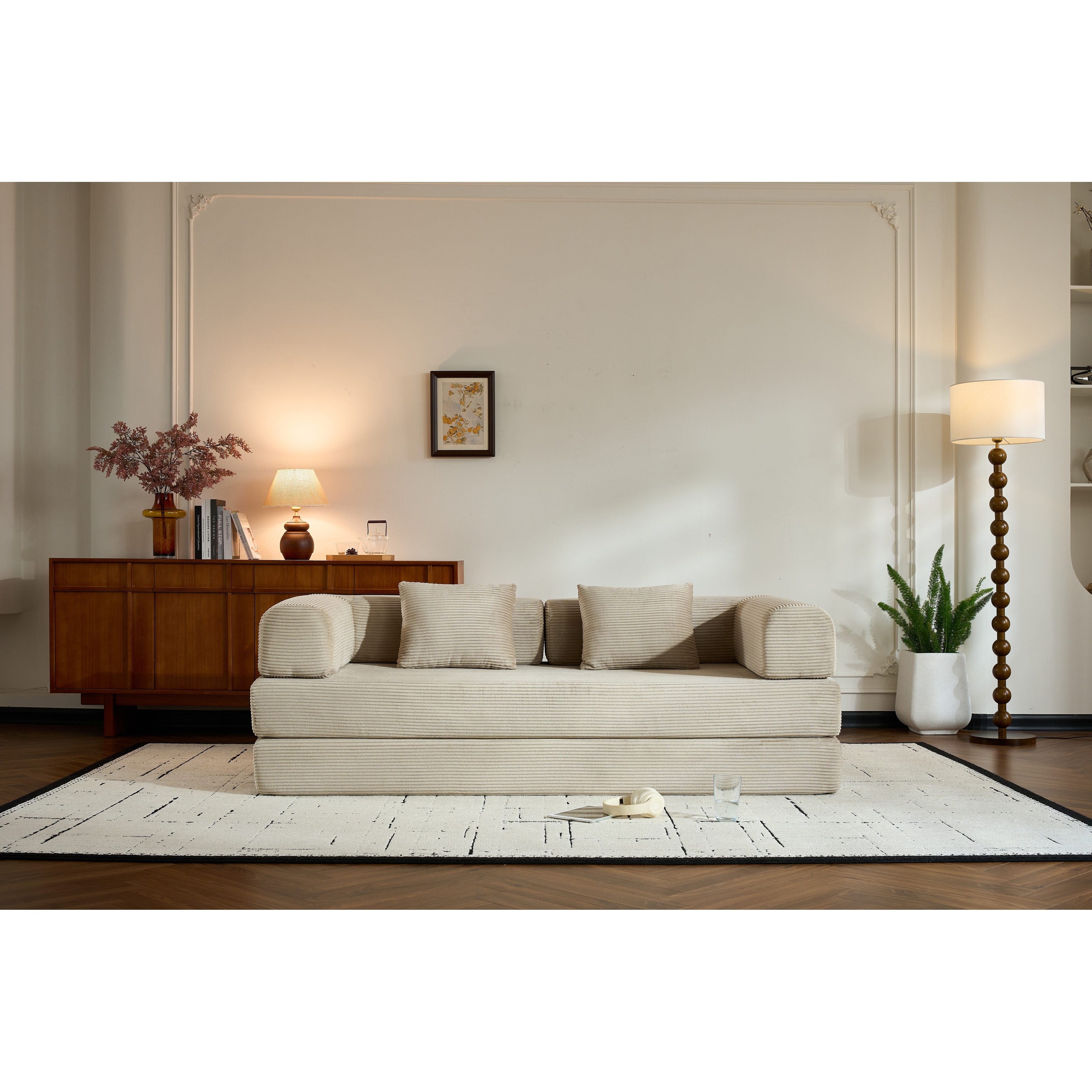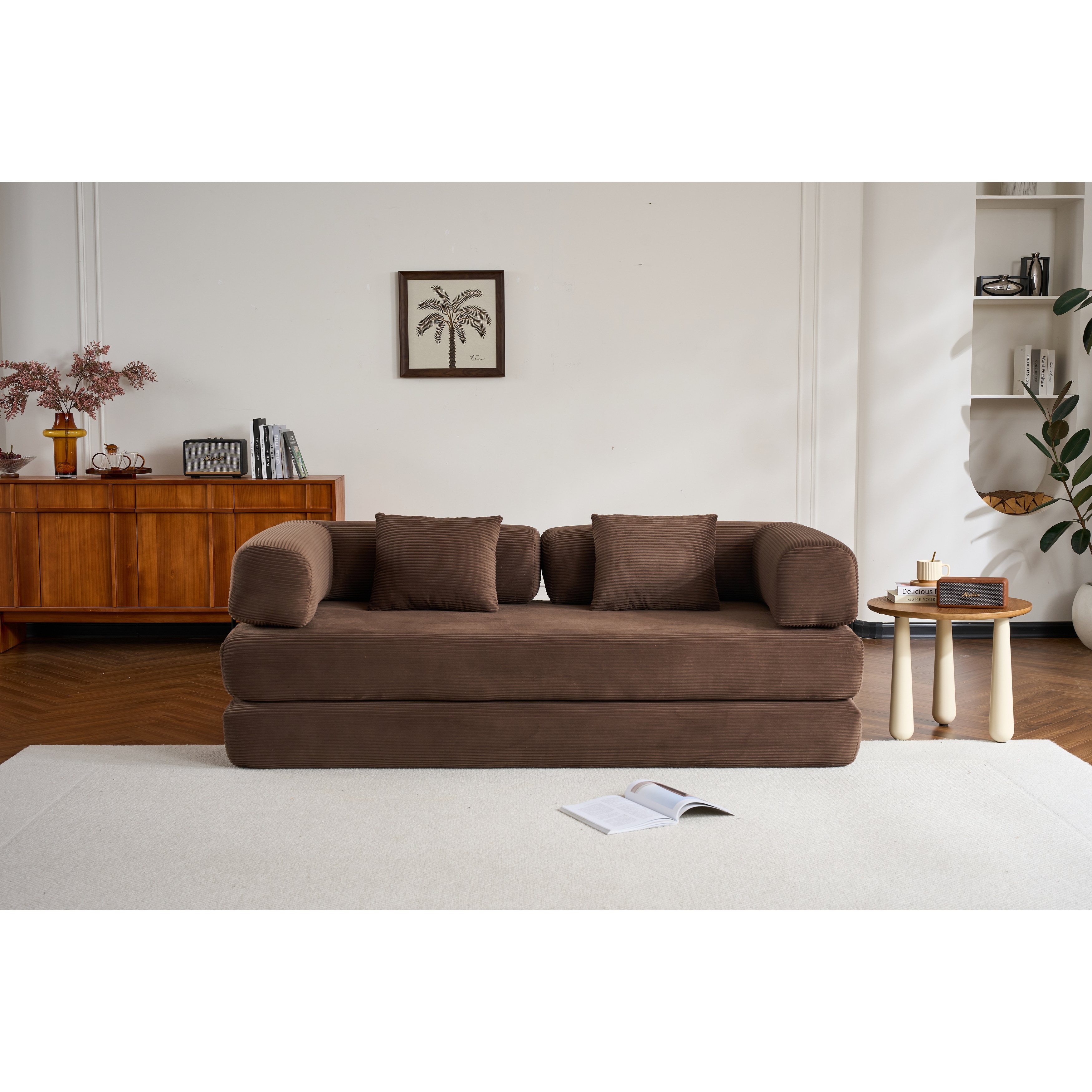 Convertible Sleeper Sofa Bed with Cylindrical Pillow – Corduroy Folding Mattress Couch, Fixed-Shape Frame, Floor Sofa Lounge.