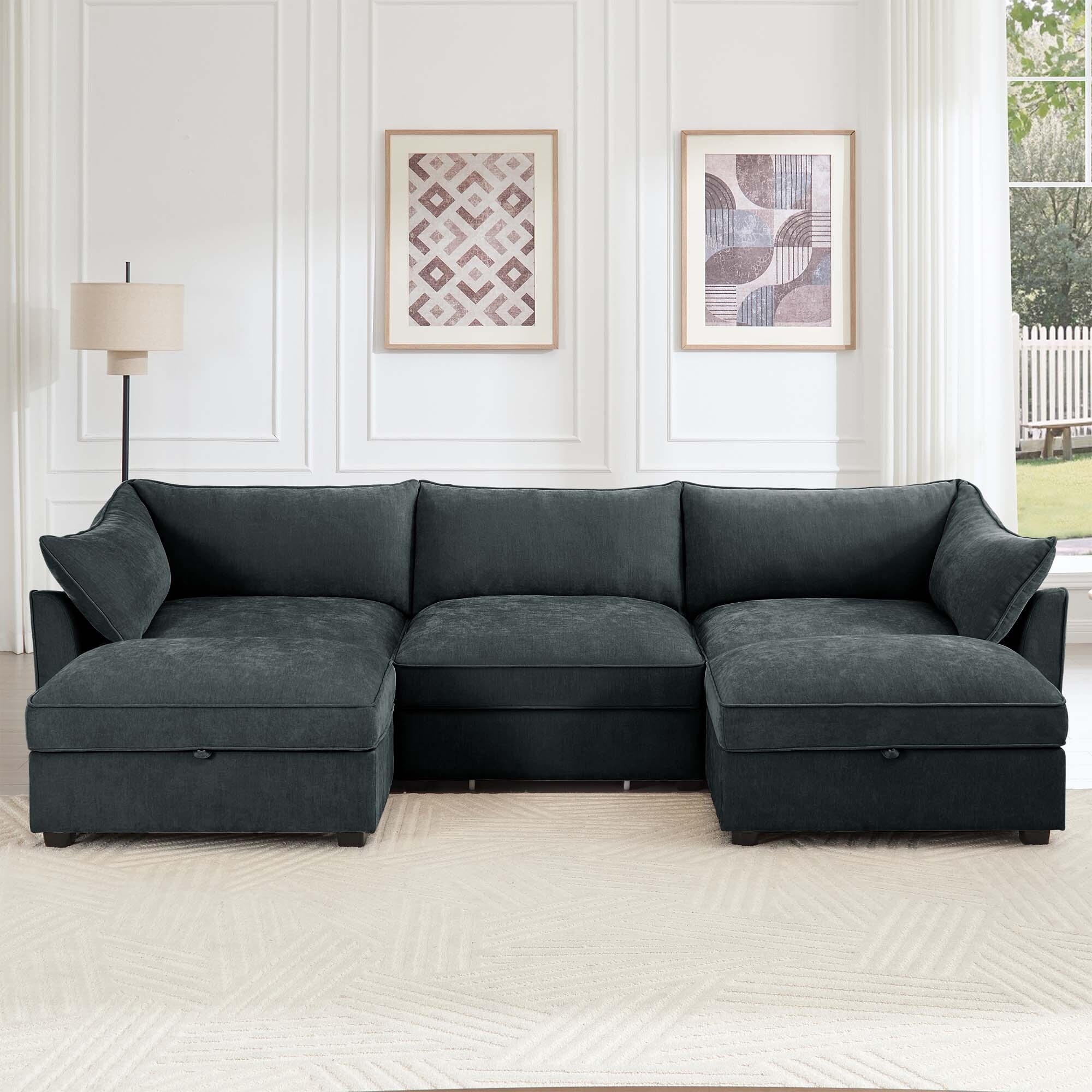Modular Sectional Sofa Set Chenille Deep Seat Chaise Lounge w/ 2 Movable Ottoman, Convertible L/U-Shape and Sofa Bed Sofa Bed