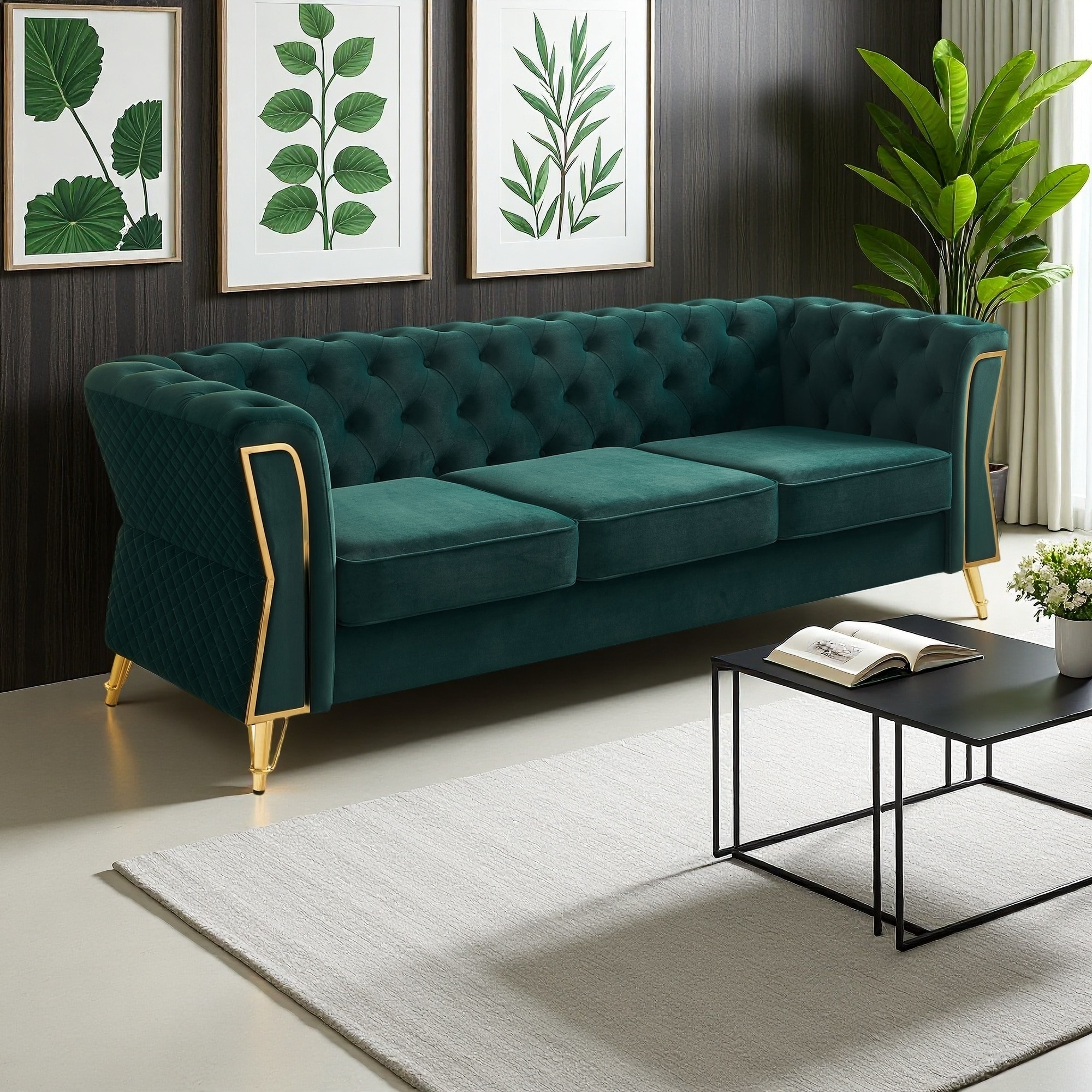 87.4" Velvet Tufted 3-Seater Sofa with Gold Trim