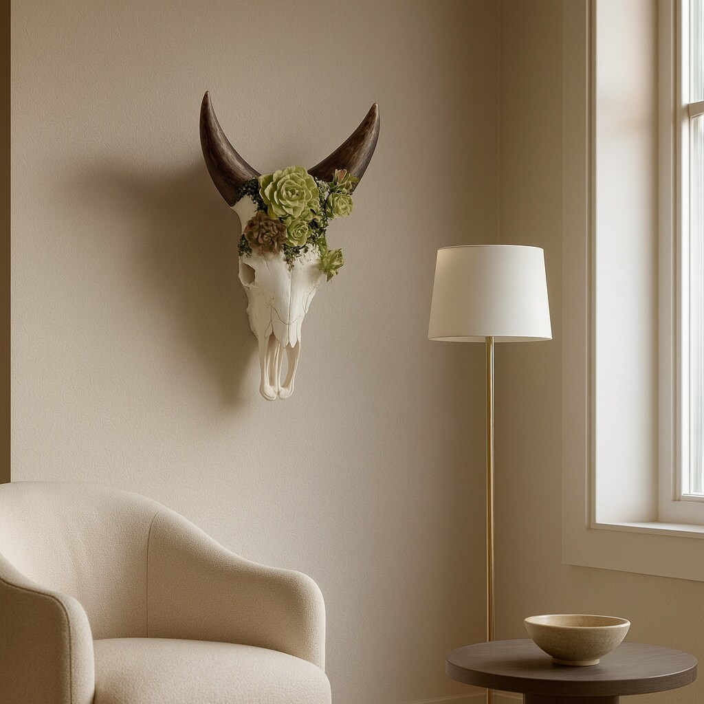Resin Bull Skull with Flower Wall Sculpture - Ivory, 18"