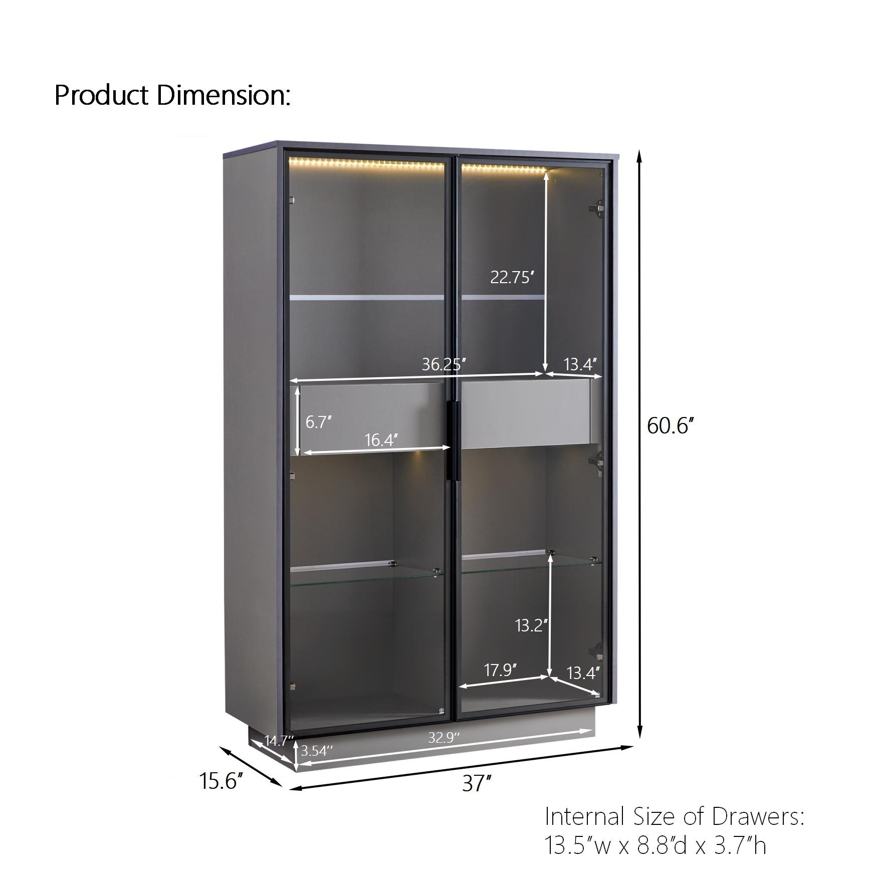 60.6'' Freestanding Glass Door Display Cabinet, Bookcase with 2 Storage Drawers, Pantry with LED Lighting and Adjustable Shelves