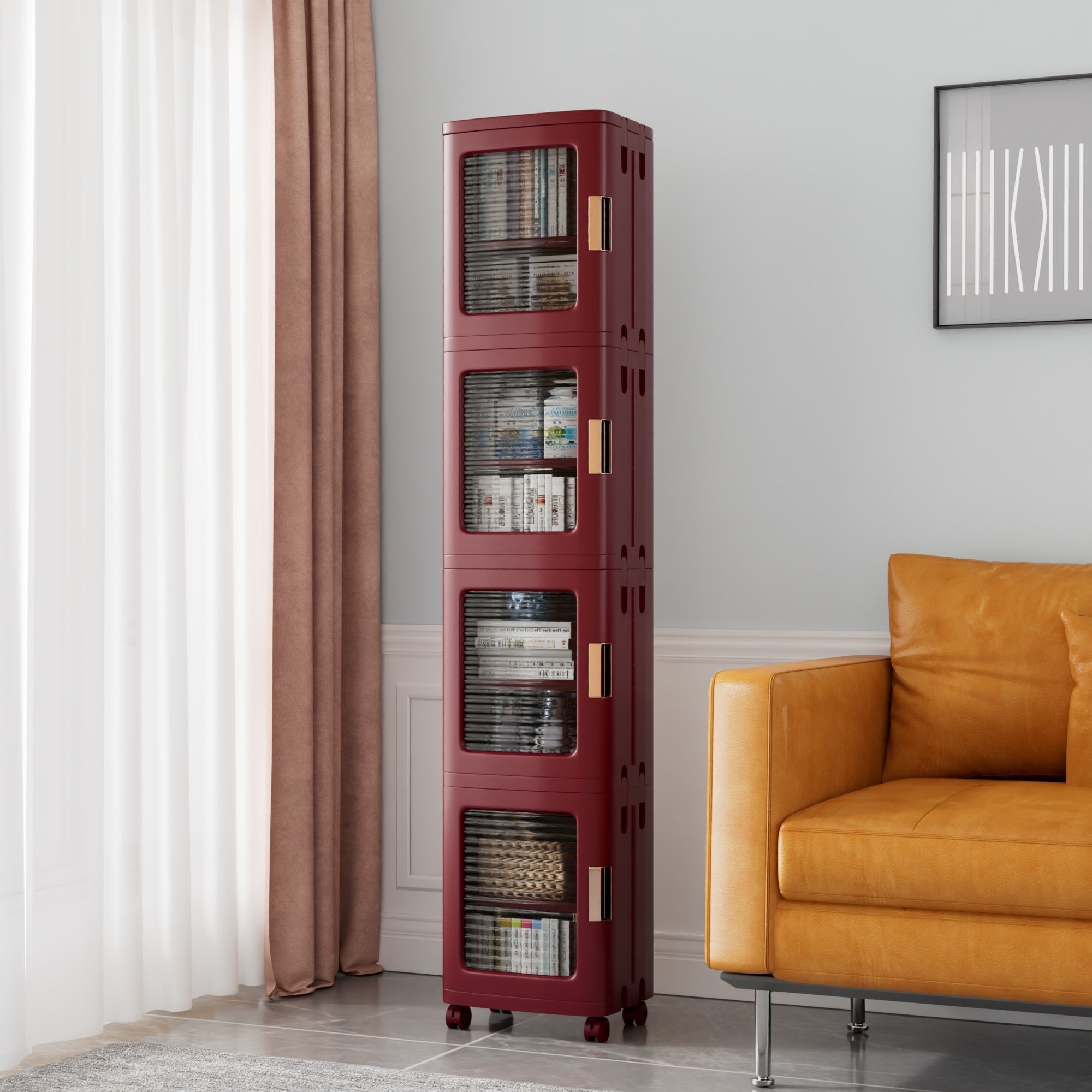 Foldable Slim Rolling Storage Cabinet with Doors 4-Tier Plastic Organizer Tower with Wheels for Bathroom or Kitchen