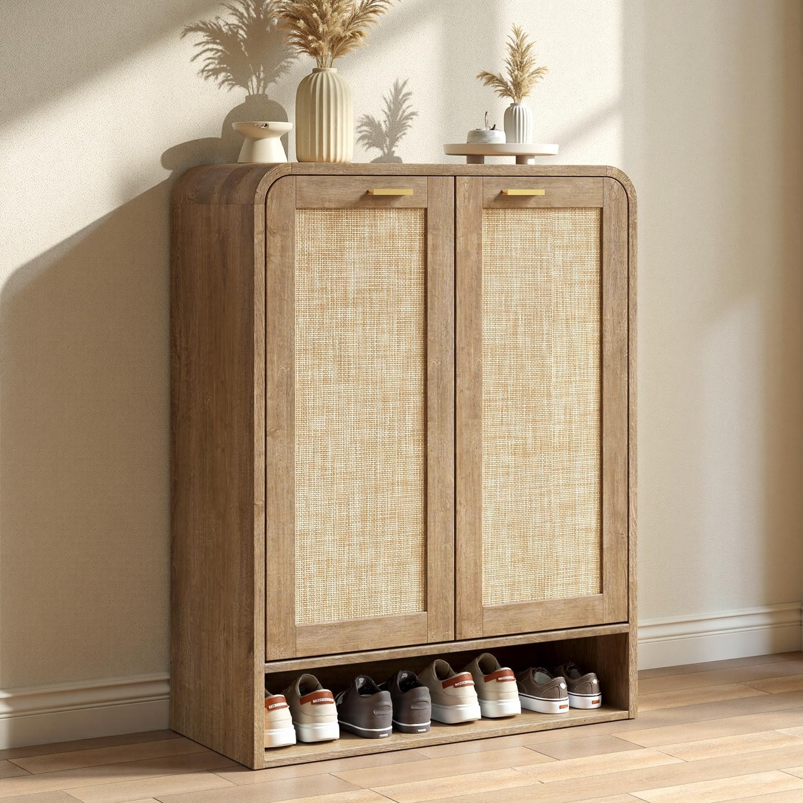 41" Tall Rattan Shoe Storage Cabinet, 24 Pairs Shoe Cabinet for Entryway, 5-Tier Boho Shoe Organizer with Doors
