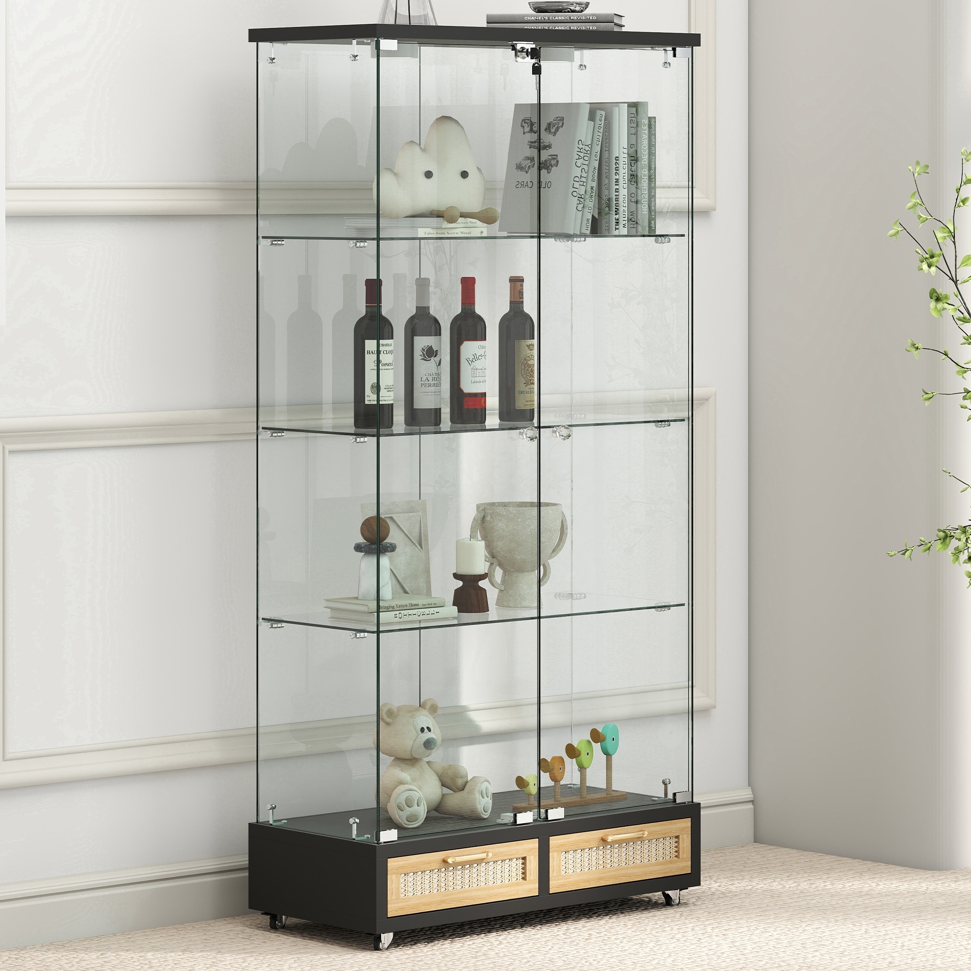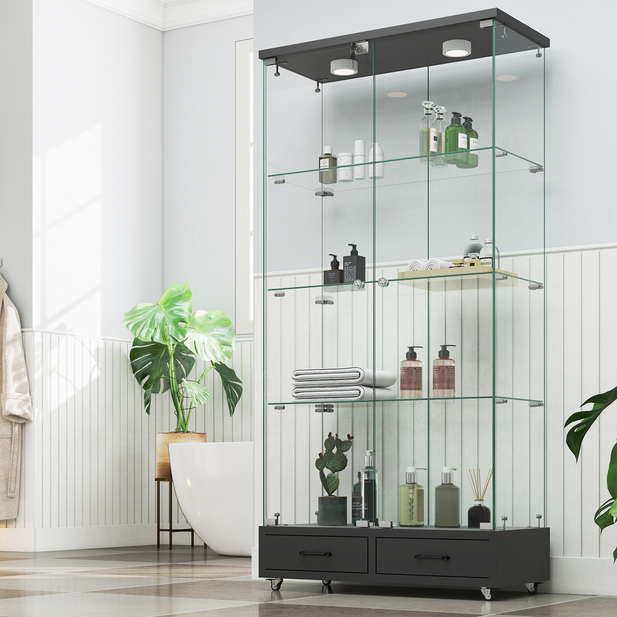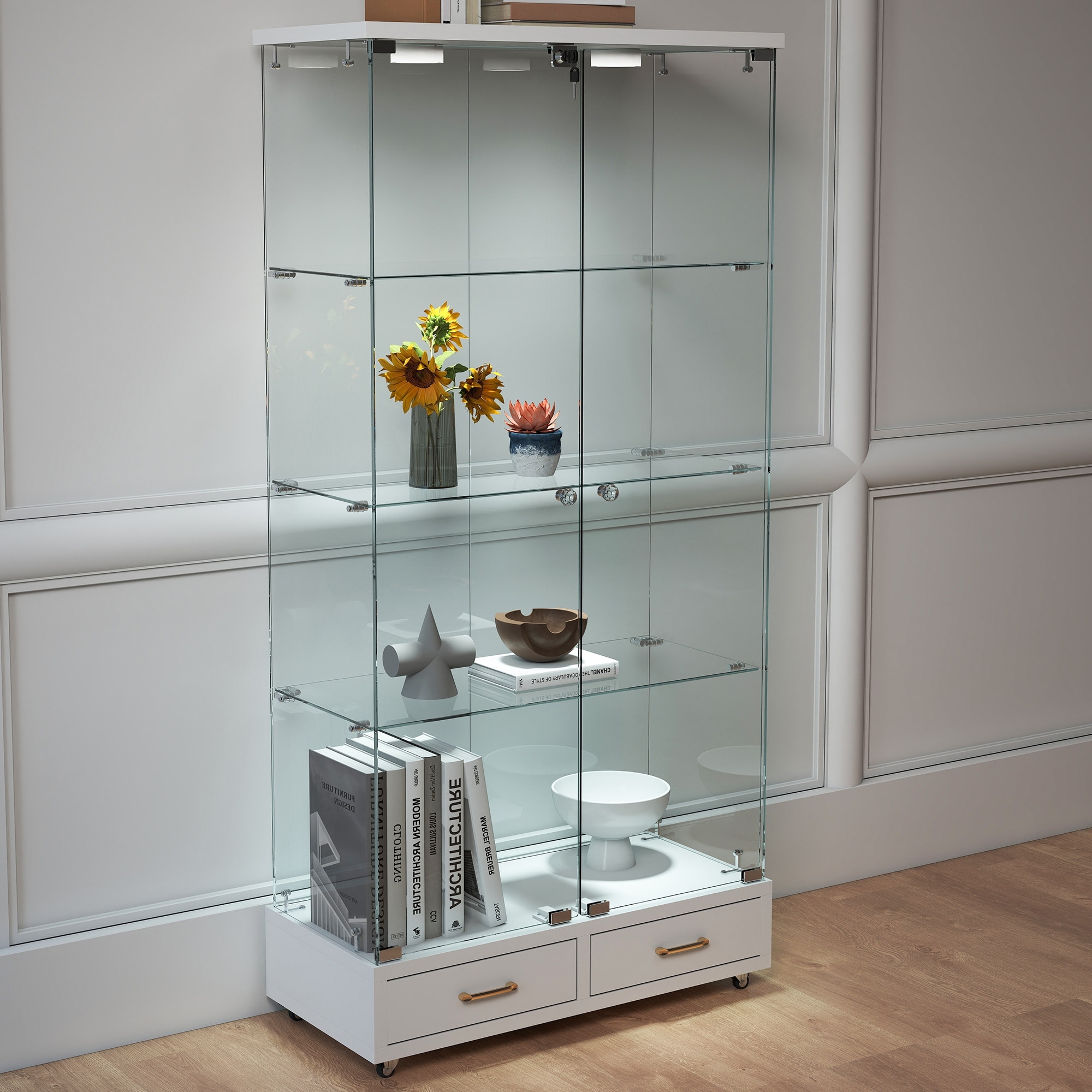 Modern Glass Display Cabinet with Large Drawers,Quick-assembly Antique Cabinet with LED lights,Tempered Glass Bookshelf,2-Door S