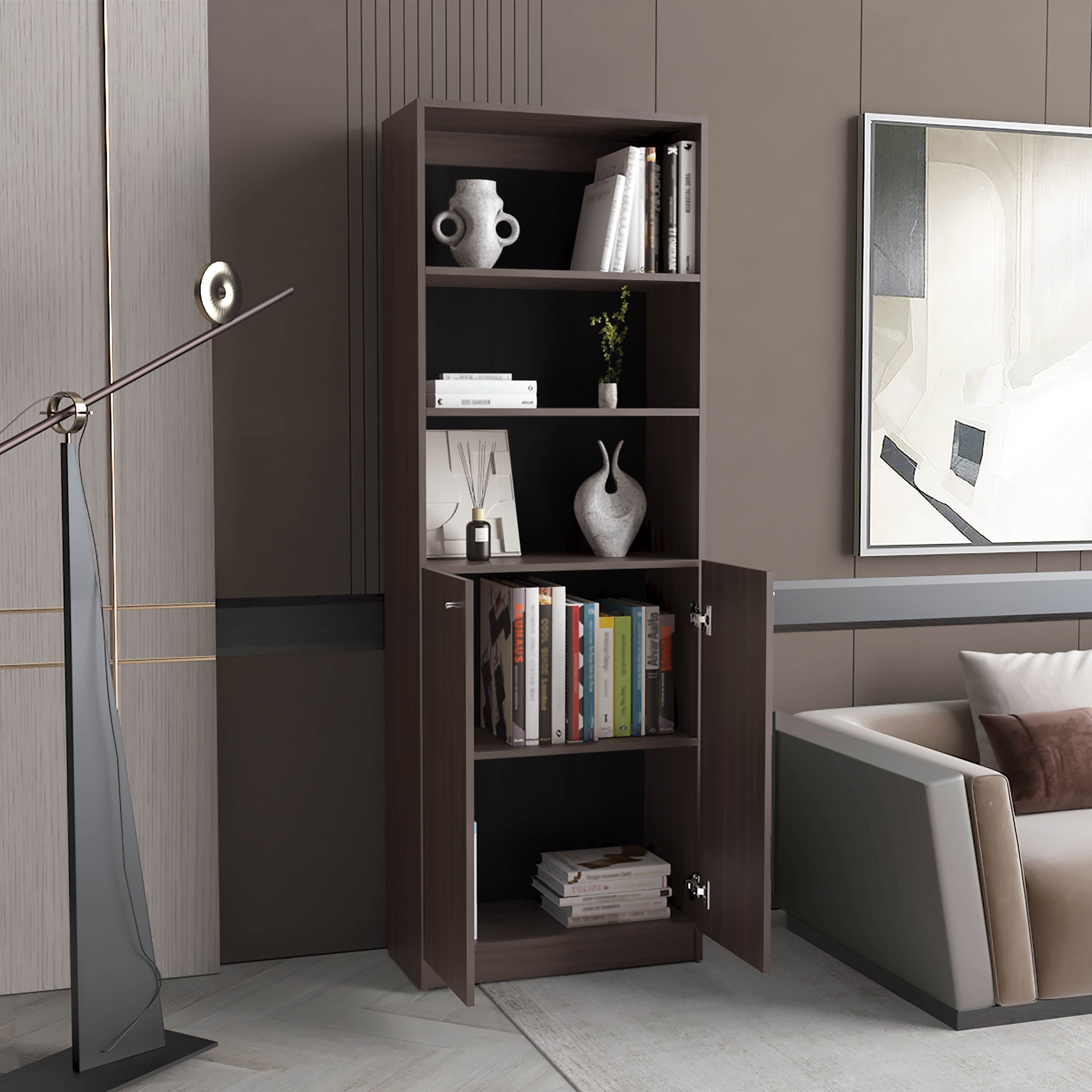 2 Door Bookcase With Two Open Shelves And Concealed Storage, Stained Walnut