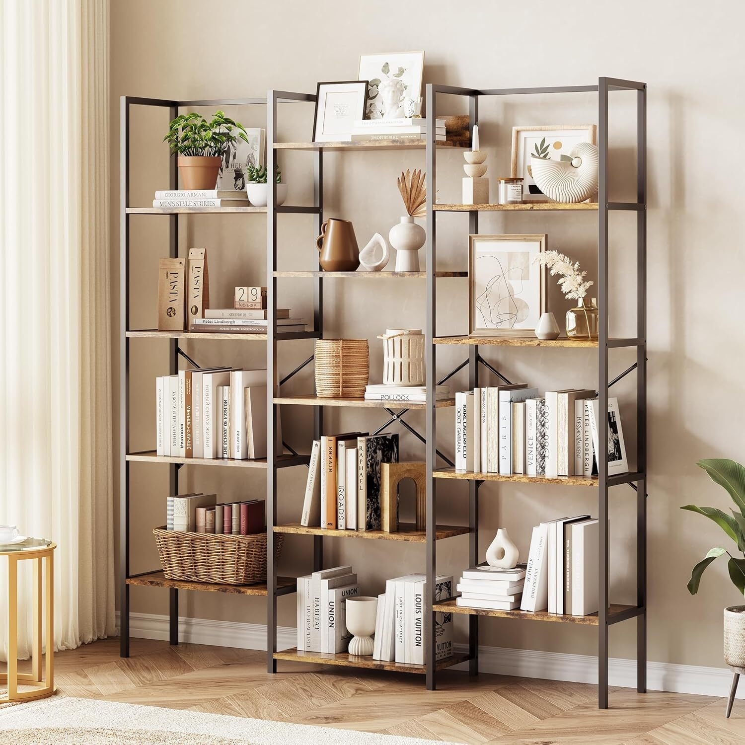 Triple Column 5-Tier Bookshelf, Rustic Bookcase with 14 Open Adjustable Shelves