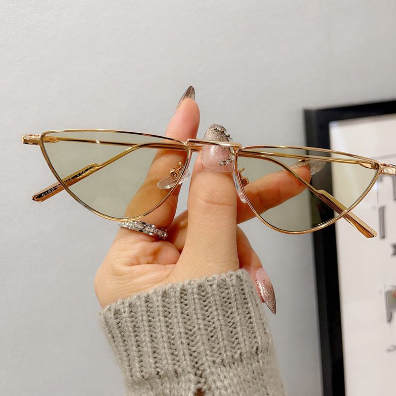 Fashion Metal Small Cat Eye Sunglasses For Women,Trendy Punk Style With Clear Ocean Lens, Hip Hop Shades gold light Green