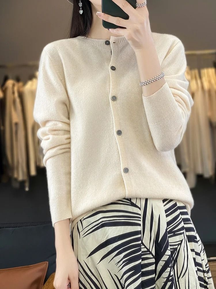 Womens 100% Merino Wool O Neck Cardigan Premium Buttoned Knitwear For Autumn & Winter white l