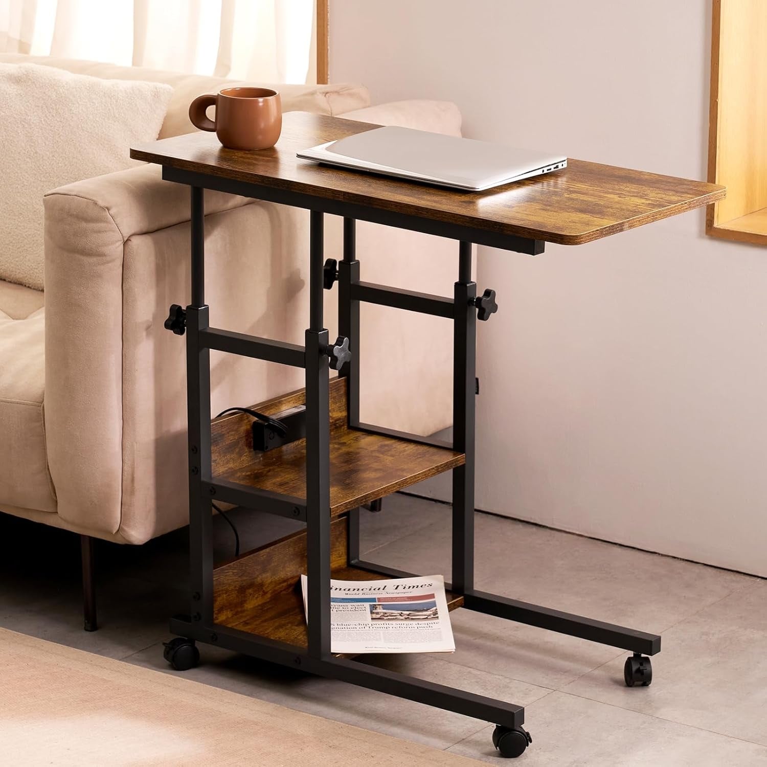 Adjustable C-Shaped End Table with Charging Station, Rolling TV Tray for Small Spaces, Slide Under Sofa