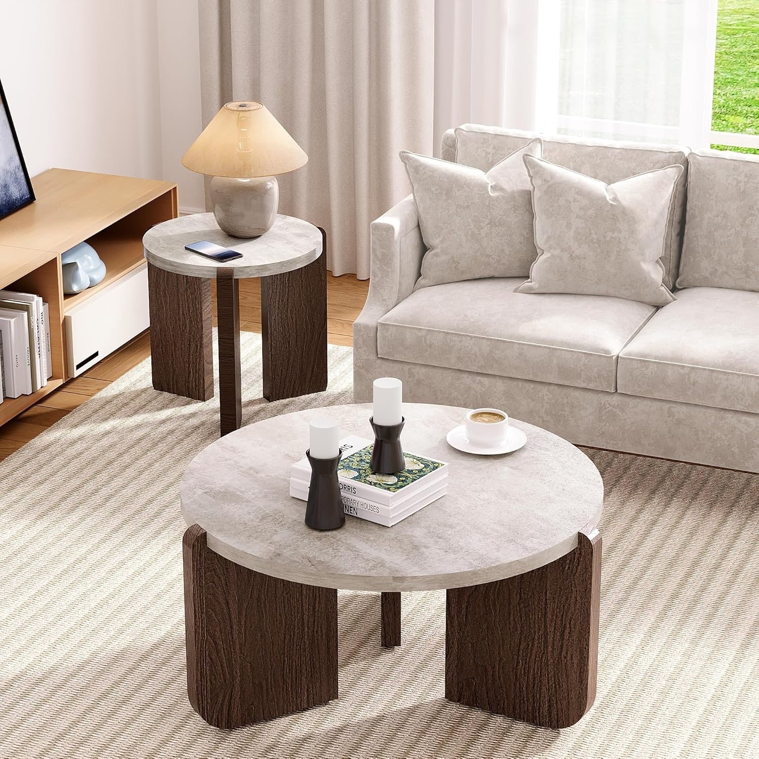 Round Coffee Table with Wood Center & Faux Marble Top, Easy Assembly