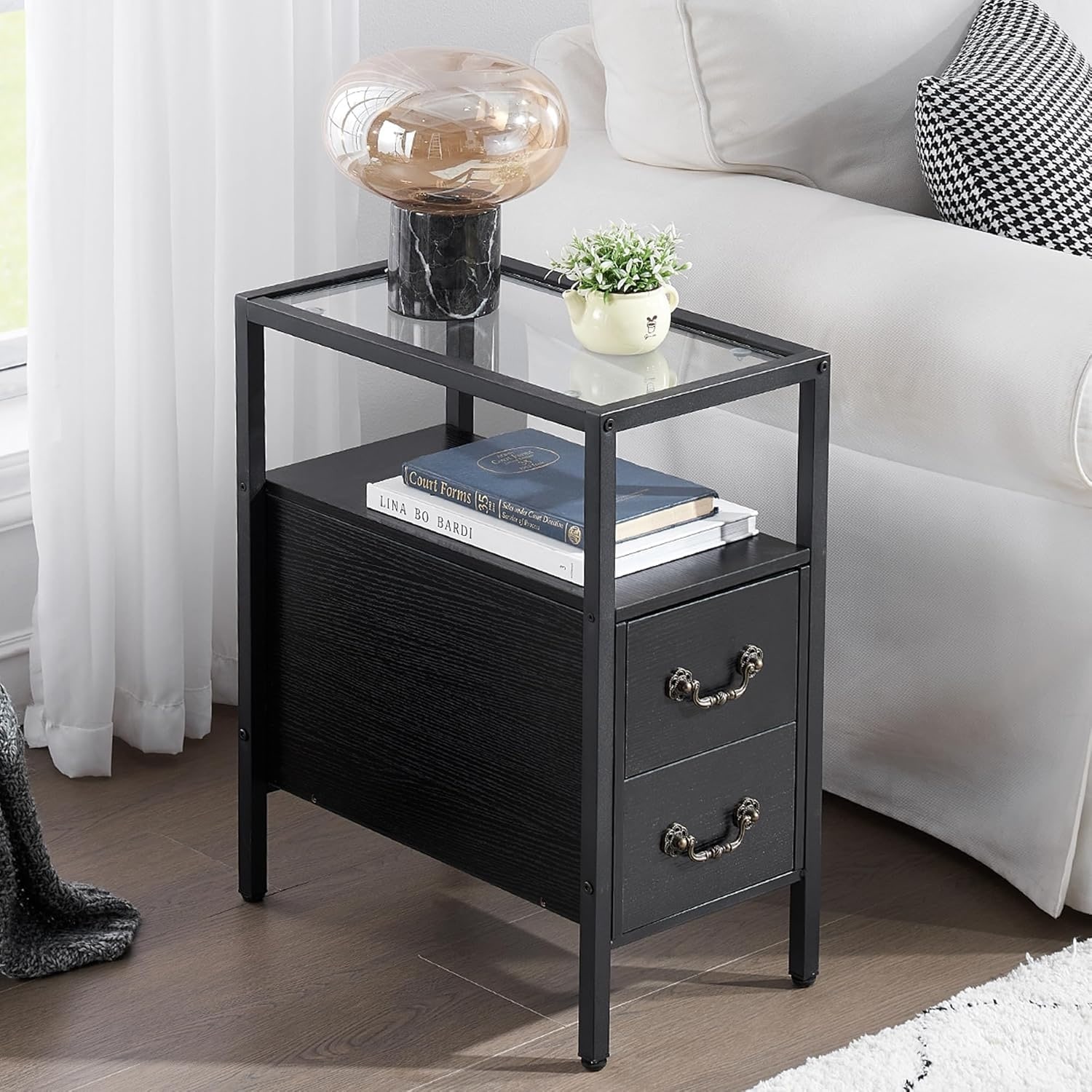 Narrow End Tables with Drawers and Shelf, 24" Height, Tempered Glass for Living Room or Bedroom