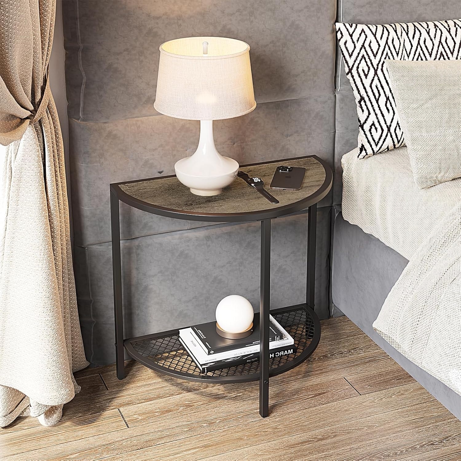 Half Moon Side Table 19.7'' with Storage Shelf, Adjustable Feet, Rustic Gray