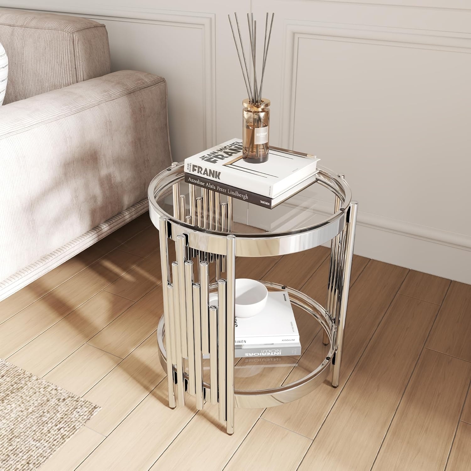 Elegant Round Glass End Table with Stainless Steel Legs, 2-Tier Accent Table for Living Room or Bedroom, Easy Assembly