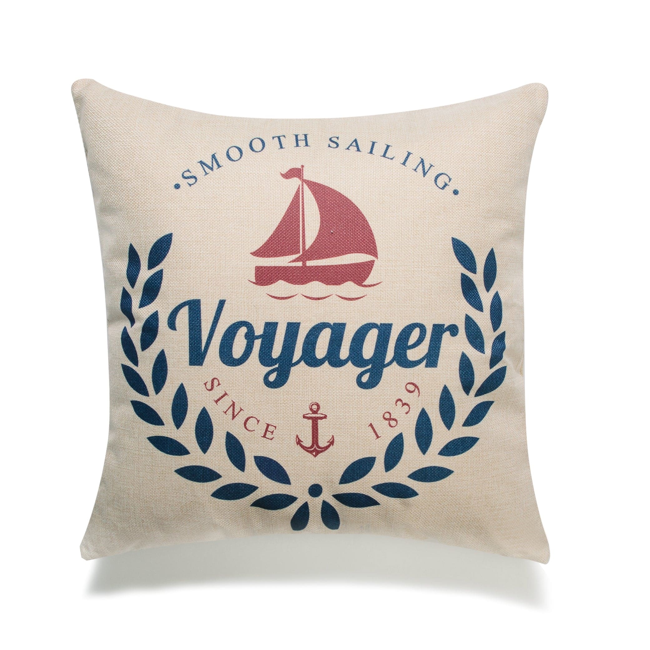 Voyager Smooth Sailing Since 1839 With Sailboat And Laurel Wreath Print And Feather Down Insert Pillow
