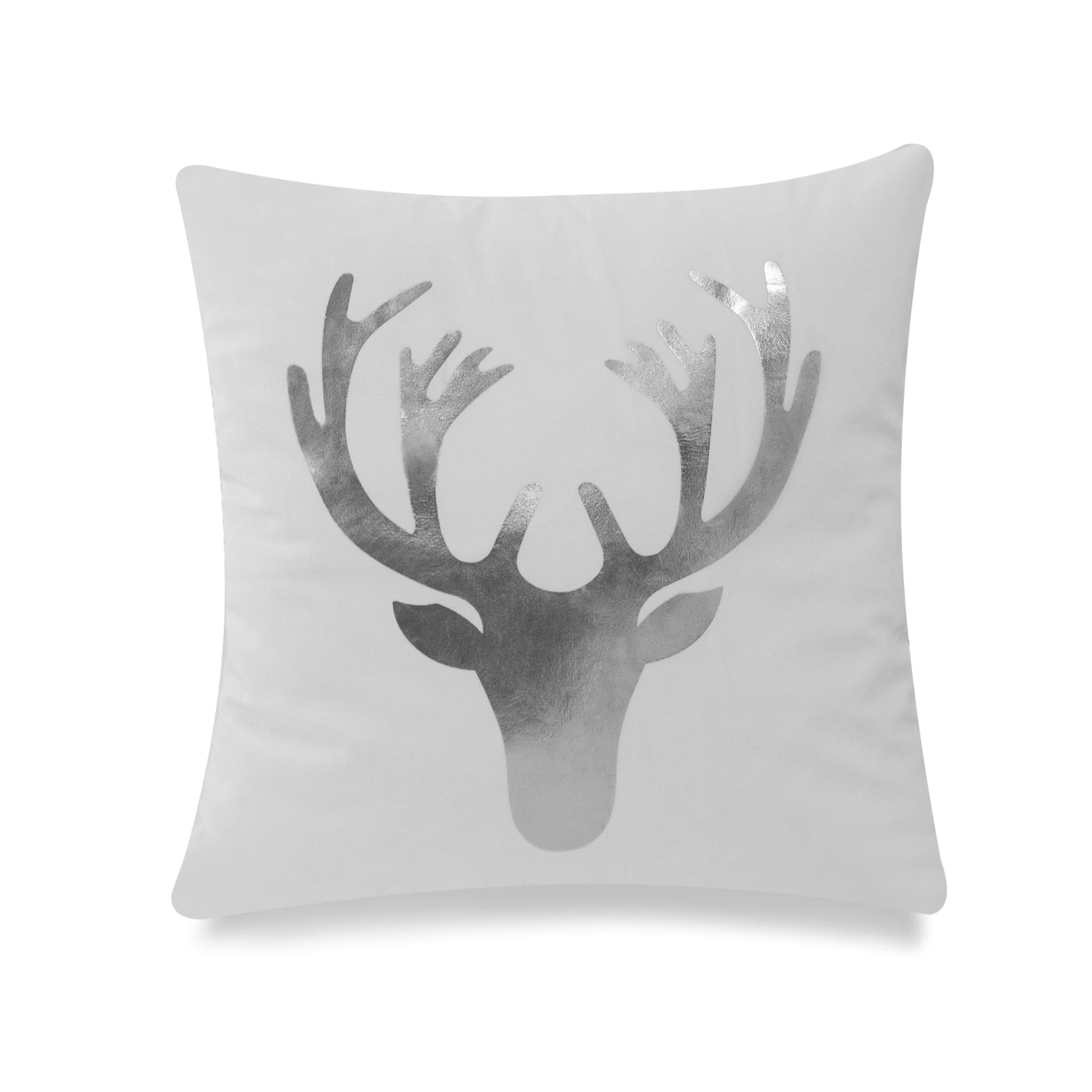Silver Foil Reindeer Head On White With Polyester Insert Pillow